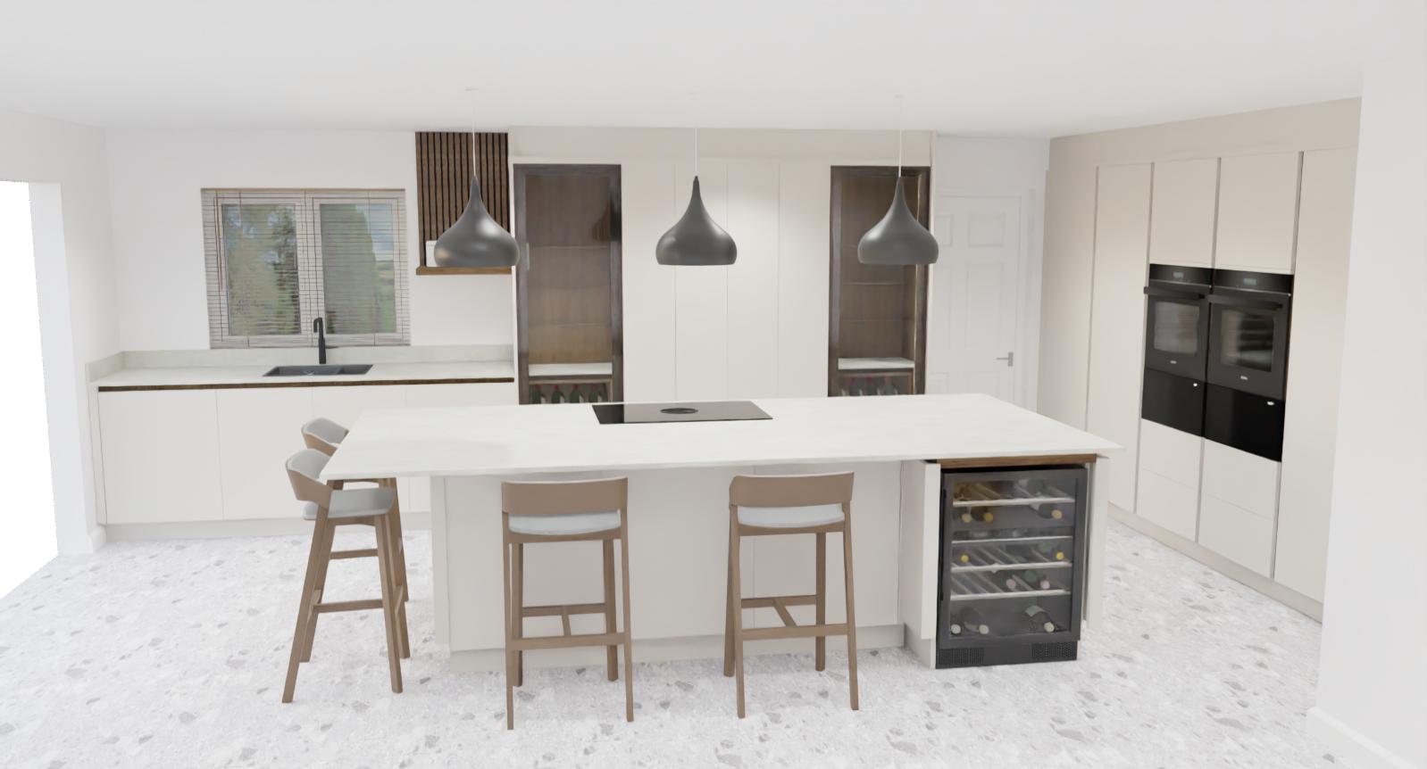 spotlights in ceiling light up the pendant lights on the island add champagne flutes and cocktail glasses into the glass cabinets add place settings to the island ready for a meal dress the kitchen natural lighting