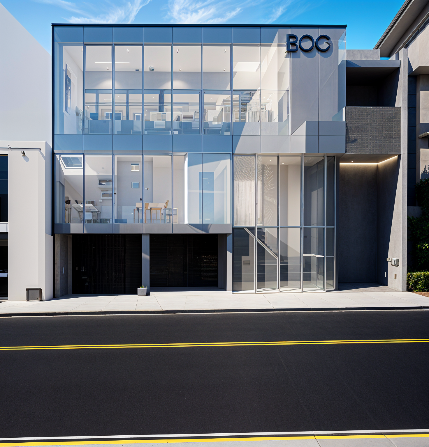 exterior shot render a sleek modern building with a glass facade the building should have a minimalist design with a transparent reflective surface that captures the sky use cool tones like light grey and silver for the structure offset by clear bright blue skies with soft scattered clouds incorporate a subtle interplay of sunlight and shadows creating a contemporary and inviting atmosphere enhance the road with smooth dark asphalt and crisp yellow road markings for contrast add a few green plants near the entrance for a touch of natural color architecture