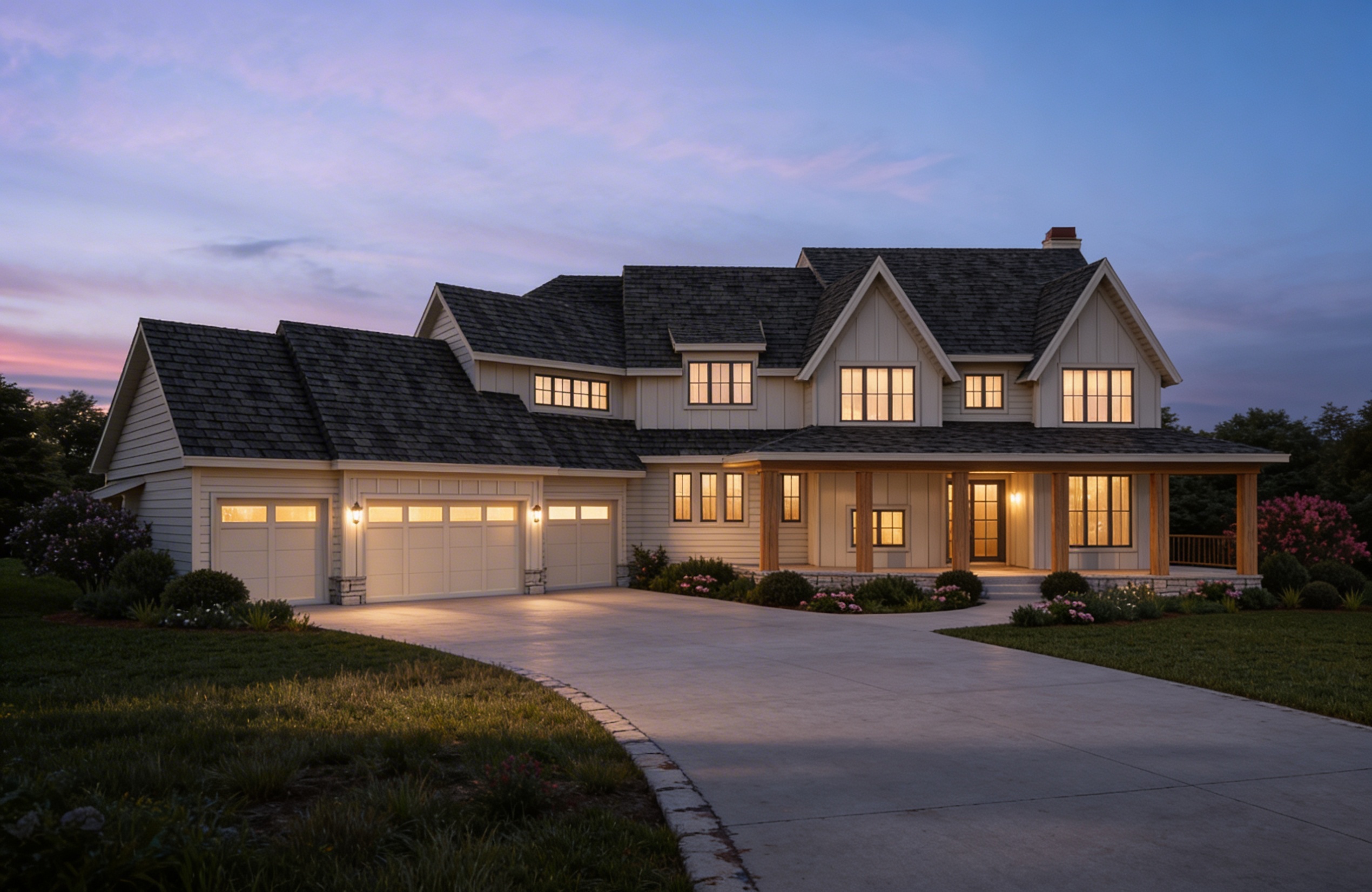 ultra photorealistic architectural rendering of a luxury modern farmhouse model home at dusk magazine quality residential architecture photography preserve the exact building design and proportions enhance realism with physically accurate materials natural lighting and cinematic atmosphere soft twilight sky with subtle pink and blue gradients warm interior lighting glowing through windows realistic reflections in glass detailed shingles crisp board and batten siding natural wood porch columns and subtle stone textures improve landscaping realism with natural plant variation slightly imperfect lawn texture soft shadows and realistic depth in shrubs and flowers refine driveway concrete with subtle surface variation and edge wear add global illumination accurate bounce lighting from porch lights and soft ambient occlusion around architectural joints shot as professional architectural photography using a full frame camera 24 28mm lens balanced composition high dynamic range crisp focus natural color grading and extremely high detail clean elegant award winning home builder marketing image suitable for luxury home magazine publication