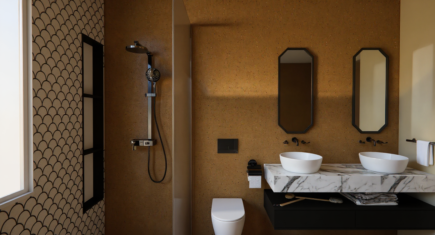 a modern architectural street scene with sleek minimalist buildings the left building features a soft white concrete fa ade with large vertical glass windows reflecting a vibrant blue sky the right building is clad in dark glossy panels contrasting with the bright surroundings the road is smooth asphalt in a rich charcoal gray with crisp white dashed lines marking the lanes a warm golden afternoon light bathes the scene casting long soft shadows and creating a serene urban atmosphere architecture