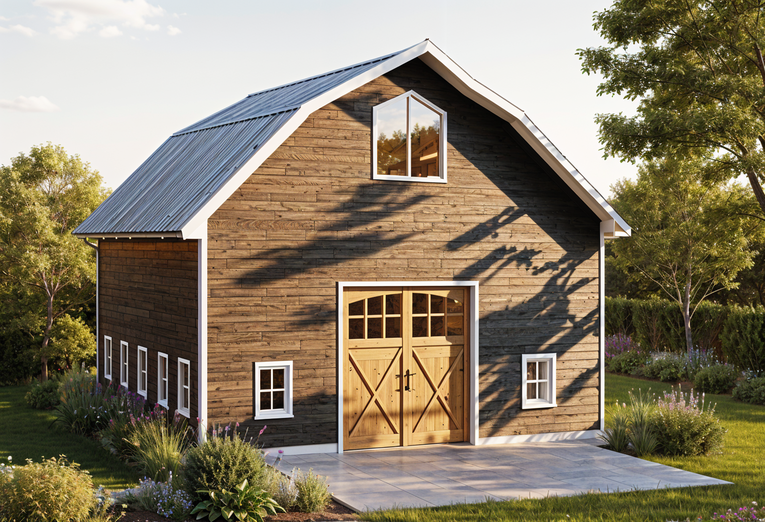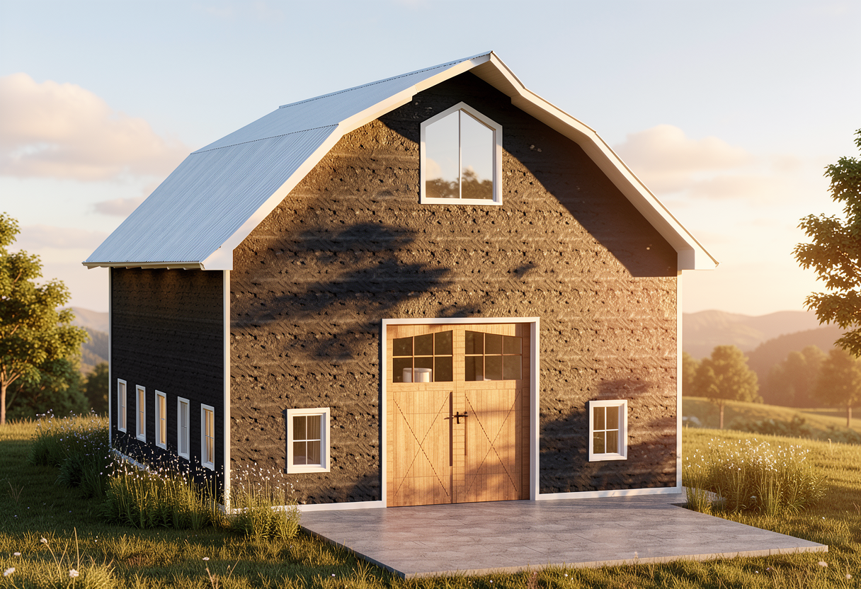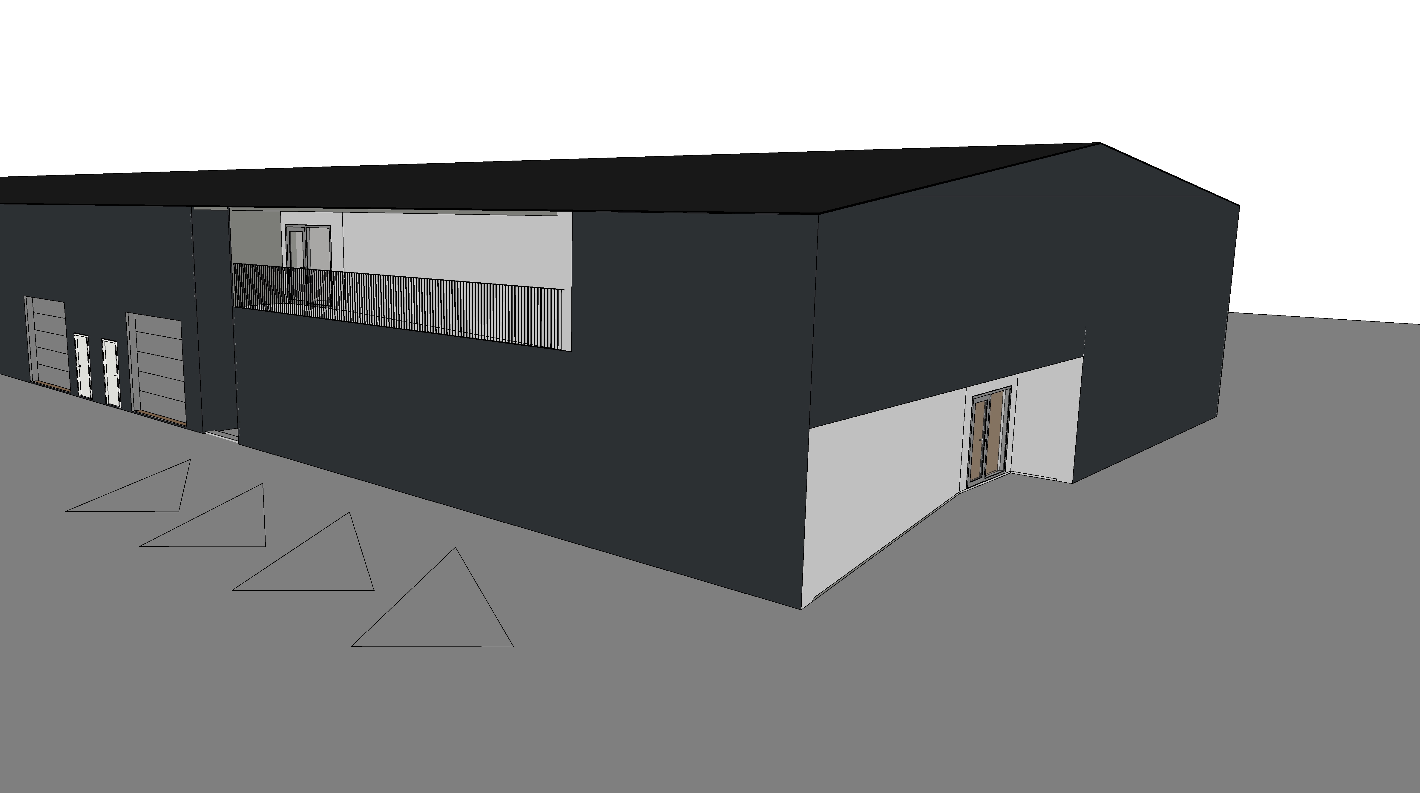 a modern industrial building with a smooth matte facade in deep near black ral 7021 anthracite grey maintain the exact building massing roofline window and door placement and proportions exactly as shown in the reference image emphasize the clean monolithic industrial expression where the facade steps inward on the diagonal surfaces apply raw cast in place concrete with subtle formwork texture and realistic edge definition create a clear material contrast between the dark metal facade and the exposed concrete recesses surround the building with a clean asphalt site surface extending naturally from the structure include a continuous 1 meter wide light concrete pedestrian walkway wrapping around the entire building perimeter with crisp edges and realistic joints use soft overcast northern european daylight for realistic industrial mood create physically accurate materials subtle roughness variation sharp but natural shadows and high detail in the facade panels concrete texture asphalt grain and glazing reflections camera at eye level three quarter architectural view slight wide lens professional architectural photography composition ultra realistic rendering high dynamic range global illumination and atmospheric depth render in hyper realistic architectural visualization quality 8k resolution