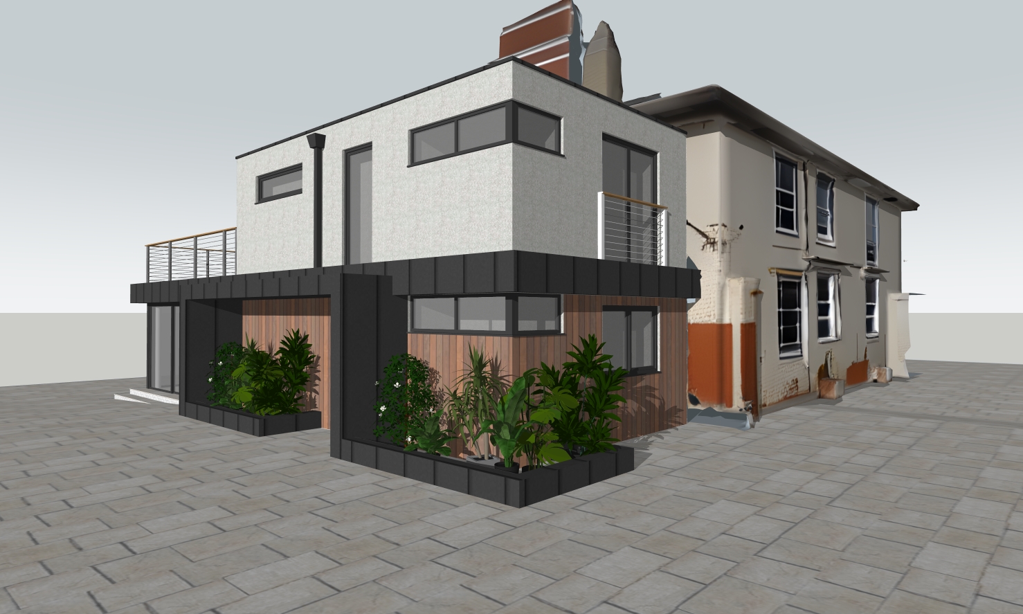 modern architectural house sleek design blending old and new styles use a soft cream color for the old building rich wooden panels for the contemporary section with sleek black accents add lush green plants around the base set against a serene light blue sky the atmosphere is peaceful and inviting the paving stones should be a mix of neutral grays and browns to add texture create a warm afternoon glow highlighting the textures and details