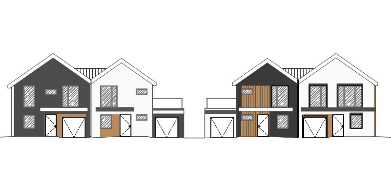 modern single family house in an urban setting low rise buildings around minimalist geometry facade of natural warm wood contrasting sections with dark anthracite plaster and light off white plaster flat standing seam graphite metal roof large panoramic aluminum framed windows realistic reflections in glass neighboring low rise buildings trees sky surrounding greenery ornamental grasses shrubs subtle garden soft natural afternoon light photorealistic ultra realistic high detail architectural visualization 8k global illumination physically based rendering sharp focus natural colors