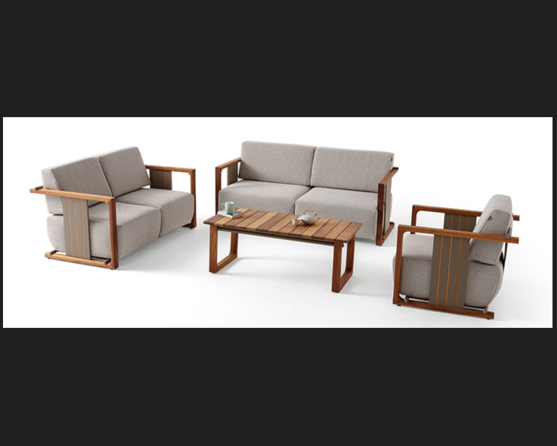 the architectural vision the house is a contemporary masterpiece of minimalist architecture designed to blur the lines between indoor and outdoor living it features an expansive facade of floor to ceiling glass walls framed by dark charcoal aluminum allowing the interior warmth to spill out onto the grounds the exterior is a tactile mix of natural cedar wood siding and smooth sand colored limestone echoing the organic tones of the furniture the landscaping the yard the yard is a sanctuary of quiet luxury a velvet smooth emerald lawn is bordered by architectural plants tall swaying ornamental grasses and sculptural japanese maples that provide a pop of burgundy against the neutral house a low profile wraparound deck made of weathered teak serves as the transition point illuminated by recessed soft glow led strips that trace the perimeter at dusk the focal point the furniture placement in the heart of the stone paved patio sits the lounge set the warm honey hued timber frames of the sofas and armchairs perfectly complement the surrounding nature the oatmeal colored textured upholstery looks soft and inviting contrasting beautifully with the vertical wooden slats of the armrests the low slung coffee table with its rhythmic wooden planks holds a simple ceramic tea set completing the zen like atmosphere the overall ambience the entire space feels like a private retreat there is a sense of profound stillness where the only sounds are the rustle of leaves and the distant trickling of a minimalist stone water feature it is a space designed not just for sitting but for unplugging and finding balance amidst elegant understated design