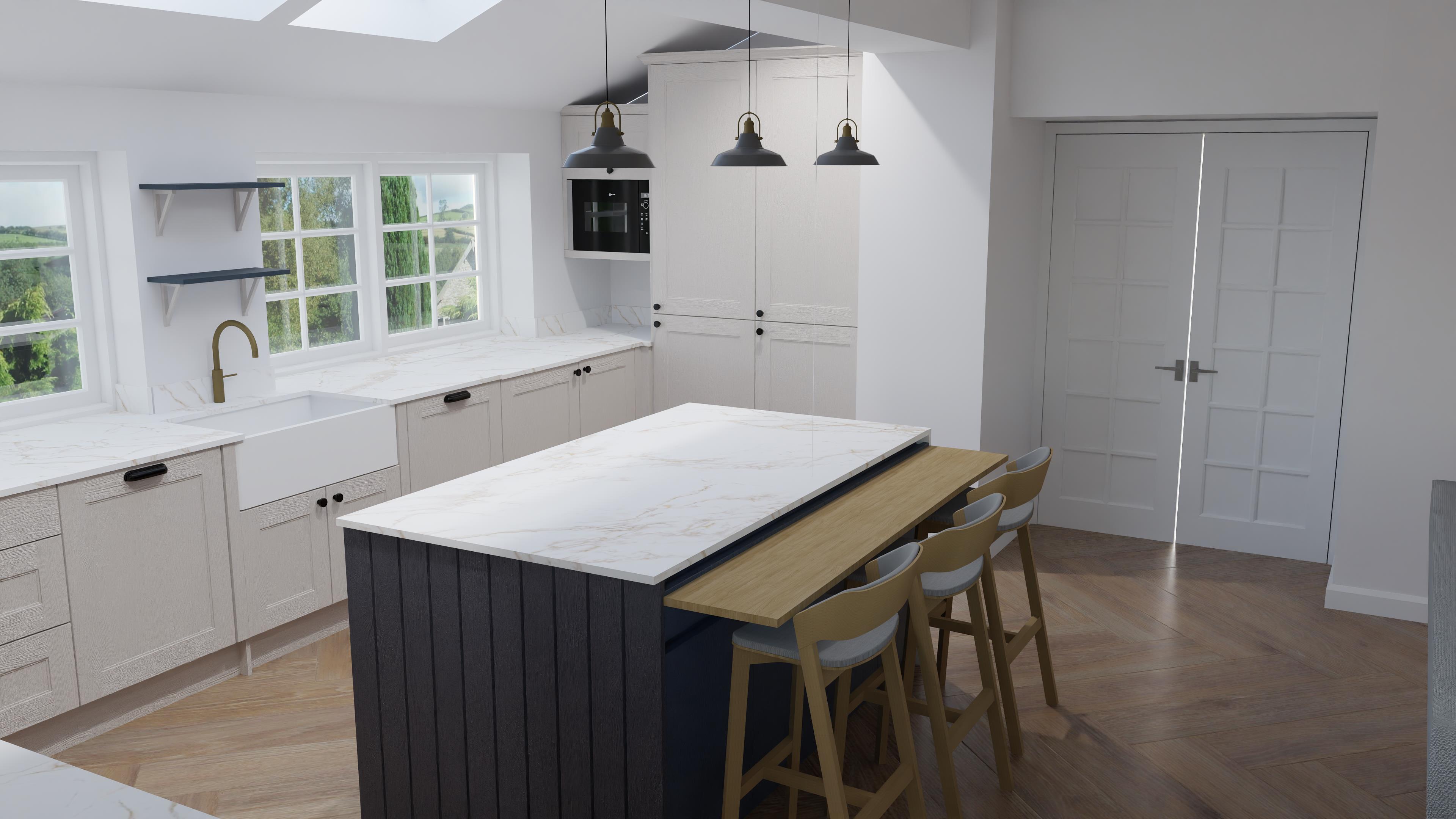natural lighting recipe books under microwave dressing on shelf chopping board with vegetables on countertop in front of window dress the kitchen add downlighting under the countertop on the panelled end of the island