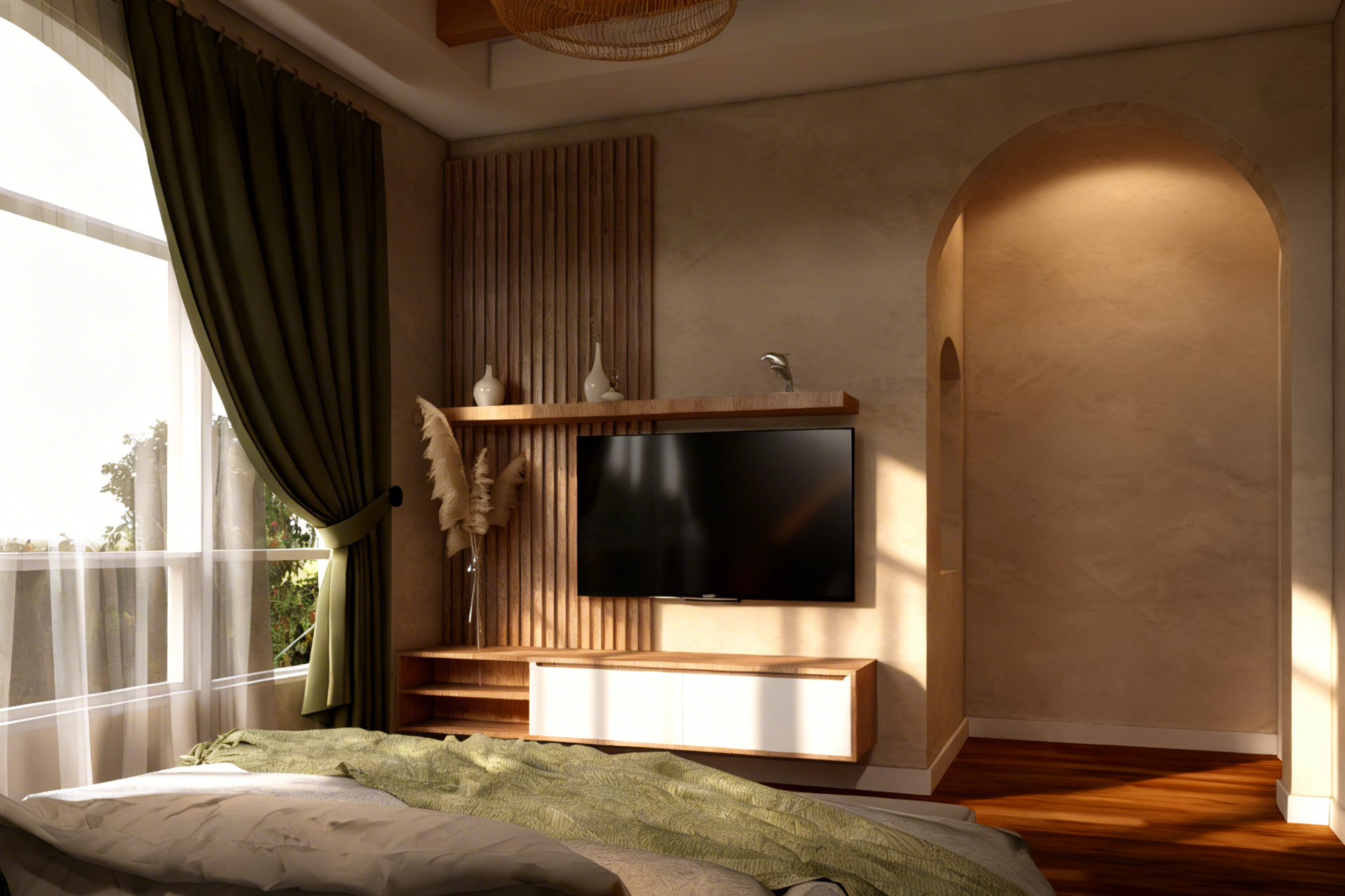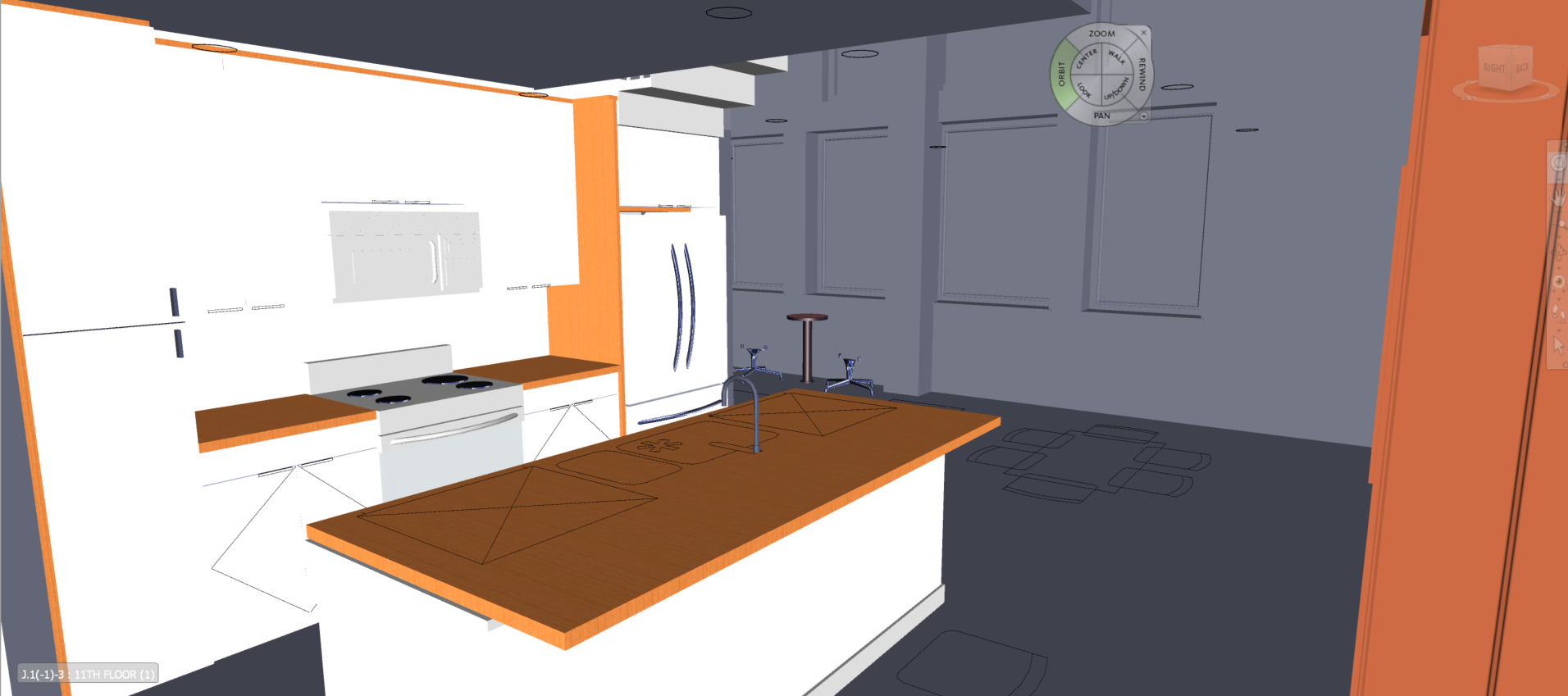 render this shaker style door kitchen with dark blue base cabinets and walnut upper cabinets cabinet above the fridge should be dark blue brass bar pull handles countertops and backsplash should be white quartz with very subtle grey and gold vein backsplash to match countertop flooring to be medium oak walls to be white window shills to be white appliances are white with brass handles