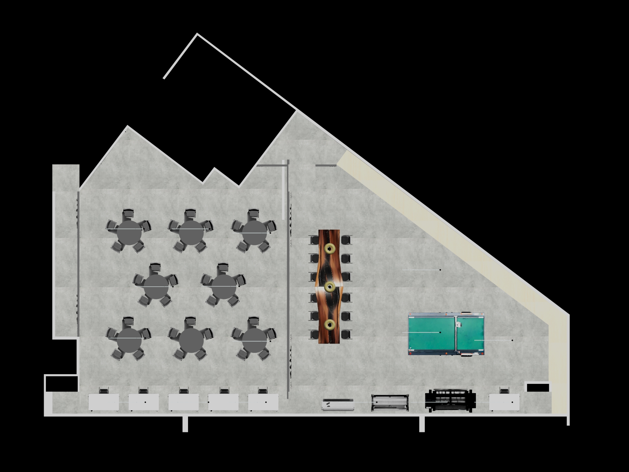 hyper realistic architectural interior visualization based exactly on the provided reference image ultra photoreal quality physically accurate rendering modern classroom environment shown in a top down plan view inspired camera angle preserving exact layout proportions and furniture placement do not change any colors materials or finishes all materials tones and textures must match the reference image precisely furniture layout multiple round classroom tables arranged as shown tabletops remain unchanged in color and material table legs are chrome metal polished and reflective table wheels casters are black matte rubber finish classroom chairs surrounding each table chair frames are grey plastic matte finish seat and back upholstery are black fabric texture realistic softness maintain exact chair geometry spacing and orientation central long communal table remains exactly as shown with the same wood tone grain and finish all auxiliary furniture storage units and equipment stay unchanged in color size and material architecture materials polished concrete floor remains identical in tone roughness and reflectivity white and light grey wall surfaces remain unchanged black ceiling zones and exposed elements remain exactly as visible overall geometry and boundaries must match the plan view precisely lighting strict requirement lighting must illuminate only from the ceiling light strips and hanging lamps visible in the image no daylight no windows contribution no hdr ambient lighting physically accurate led light behavior with correct falloff indirect bounce and soft shadows realistic reflections on chrome table legs and subtle highlights on plastic chair frames rendering style photorealistic pbr materials global illumination ray traced lighting accurate exposure neutral white balance crisp focus architectural visualization quality ultra high detail realistic scale 8k clarity function the space must clearly read as a classroom learning environment not a caf lounge or recreational space dark grey round tables plain background outside the floorplan