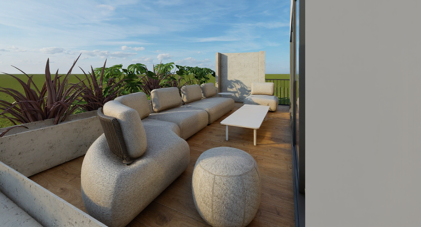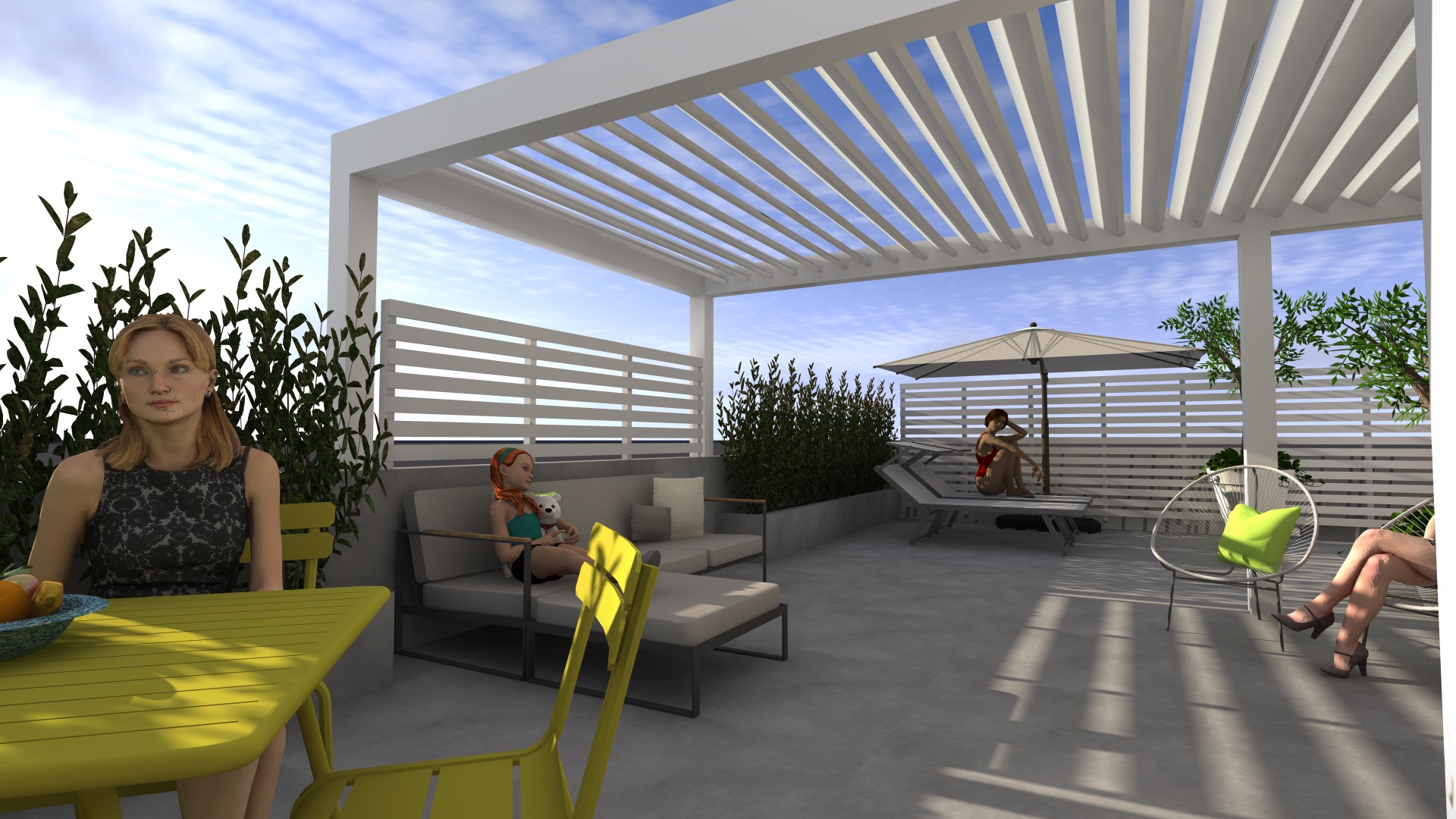 a modern and elegant penthouse with white bioclimatic pergolas sunlight at sunset