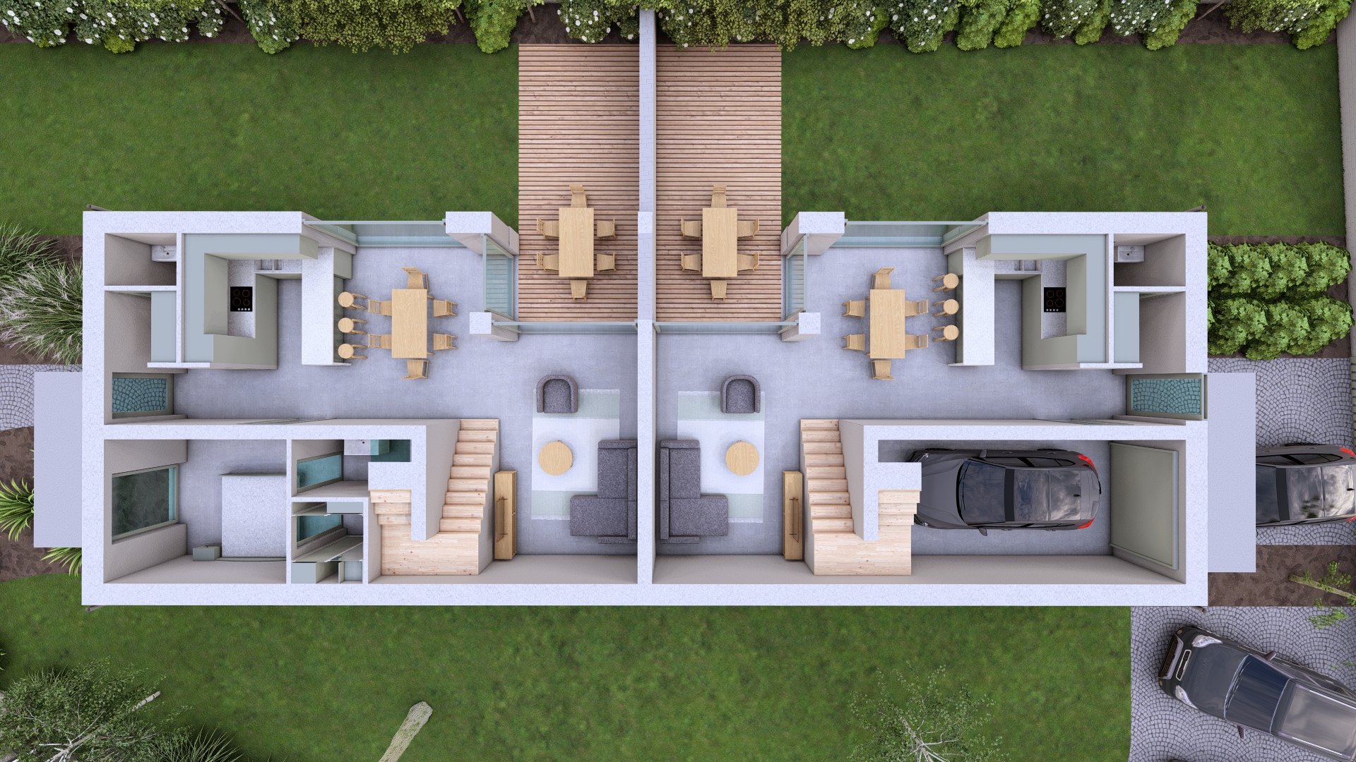 decorate the interior give the interior japandi style put outdoor furniture to the terrace add lights to the interior use ceramic floor in the outdoor change the grass and plants to something more realistic