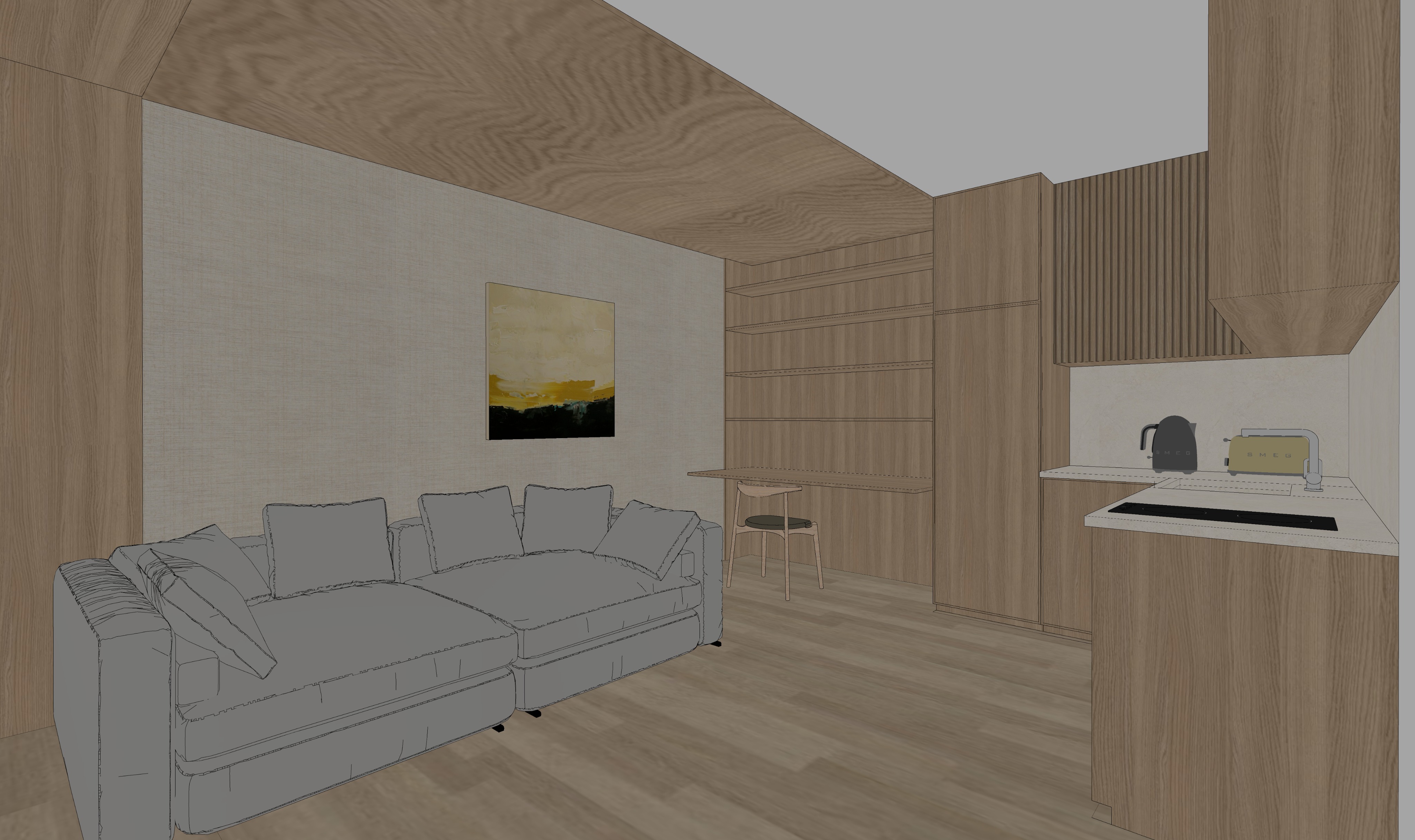a modern living room with a cozy and inviting atmosphere the sofa is plush with a dark grey color creating a contrast against the soft beige walls the wooden shelves and paneling are made of rich mahogany giving a warm and natural feel a large window allows natural light to flood the room highlighting the subtle texture of the cream colored carpet the ceiling and floor have a matching light oak wood finish adding to the spaciousness the overall ambiance is calm and elegant perfect for relaxation and comfort light wood
