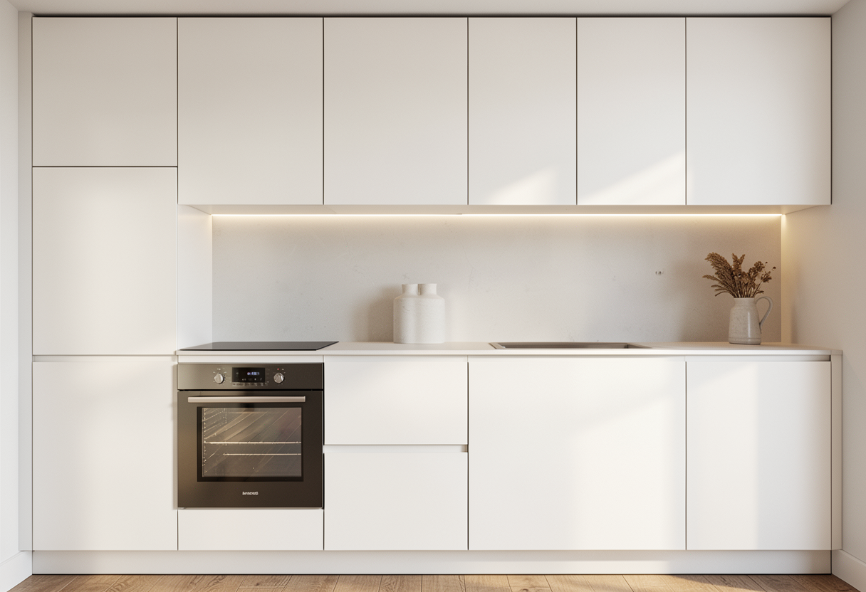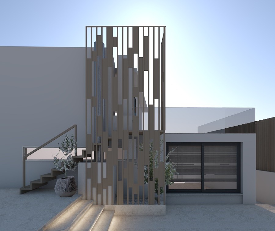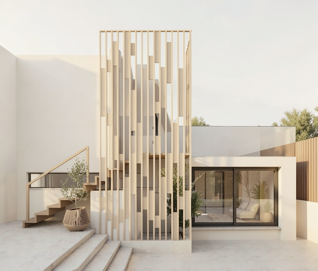 a calm elegant contemporary outdoor courtyard with a minimalist architectural language the scene features a tall central decorative screen made of vertical beige slats creating a refined semi transparent partition and adding rhythm depth and visual lightness to the composition the surrounding walls are smooth warm white plaster keeping the palette soft and understated lighting should be soft and natural like late afternoon daylight with gentle shadows and a calm luxurious mood the final render should look refined realistic and architectural with strong material clarity and a high end design feel