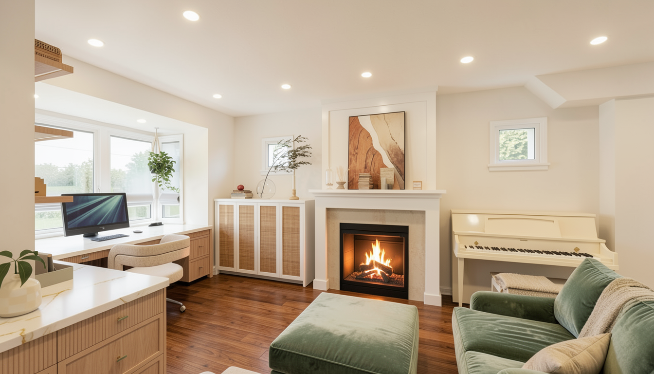 do not change model or replace furniture a cozy modern living room with a warm and inviting atmosphere the walls are a soft off white and the ceiling features recessed lighting with a gentle glow a large abstract painting with earthy tones embellishes the mantle above a white fireplace flickering with a vibrant orange and yellow flame on the right side a classic ivory piano adds elegance the hardwood floor is a rich oak brown while armchair and ottoman is upholstered in a soothing sage green velvet a lush green plant in a white pot hangs by the window enhancing the natural light filtering through accentuate this serene environment with touches of warm wood and soft textiles on the left side desk area countertop for the desk area is white with very subtle white marble