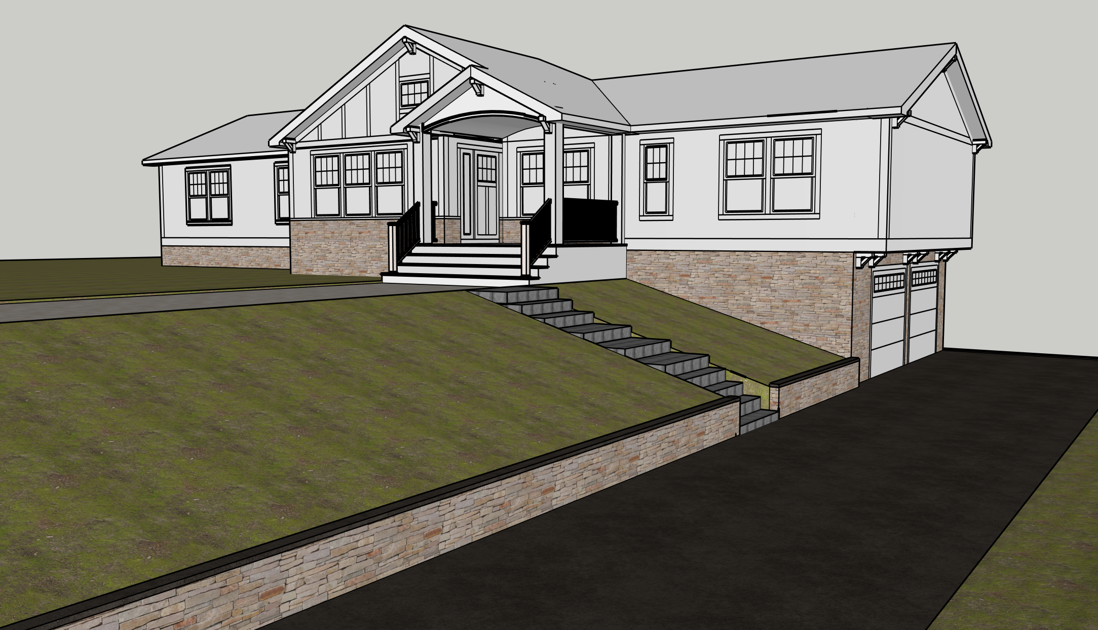 white trim and off white clapboard siding white cottage mullions grey stone stacked stone veneer in place of the brick grey tone patio pavers shrubs and flowers near the house trees behind the house and one in the foreground for shaddow and lighting to be realistic white wood furniture on the covered porch and people placed in the image to show realism and proper scale keep the image as close to the original as possible add a walkway from the middle of the stair straight out to the street the driveway is just asphalt and stops just beyond the garage doors grass in the backyard and shrubs between the driveway and the grass the stone stairs shall be large slabs of bluestone widen the driveway and and keep the retaining wall keep the image realistic tone the color down a bit so it looks more realistic remove the large bush in front of the window remove the large tree in the front further in the foreground so it doesn t block as much of the house but keep the shaddows the same remove the horizontal slats in the front gable and just use white board and batton sidding tone down the brightness to make shaddows more realistic add an suv in the driveway make the image look like a real photo