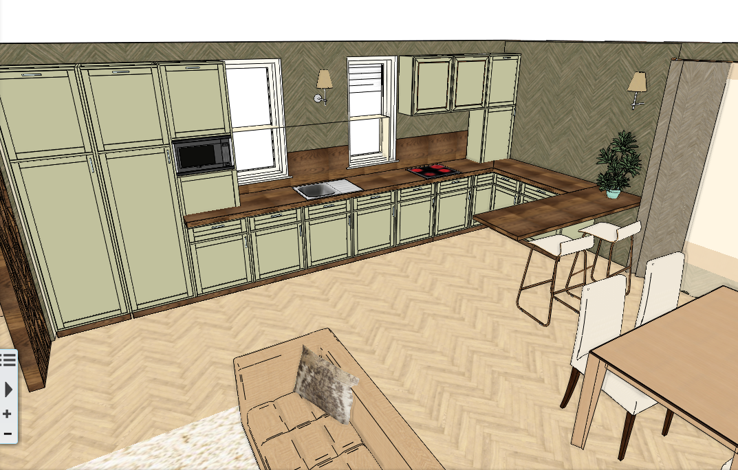 interior shot please create a kitchen with a slightly rustic yet modern feel the kitchen furniture is a pale gray green color the worktop and the backsplash are walnut colored the base is also walnut colored the walls are covered in a darker gray green wallpaper with a subtle pattern the floor is gray brown parquet the sofa is beige the dining table is also wood colored the dining chairs are darker the blackout curtains are dark beige there is a wall lamp on the wall in the middle of the kitchen