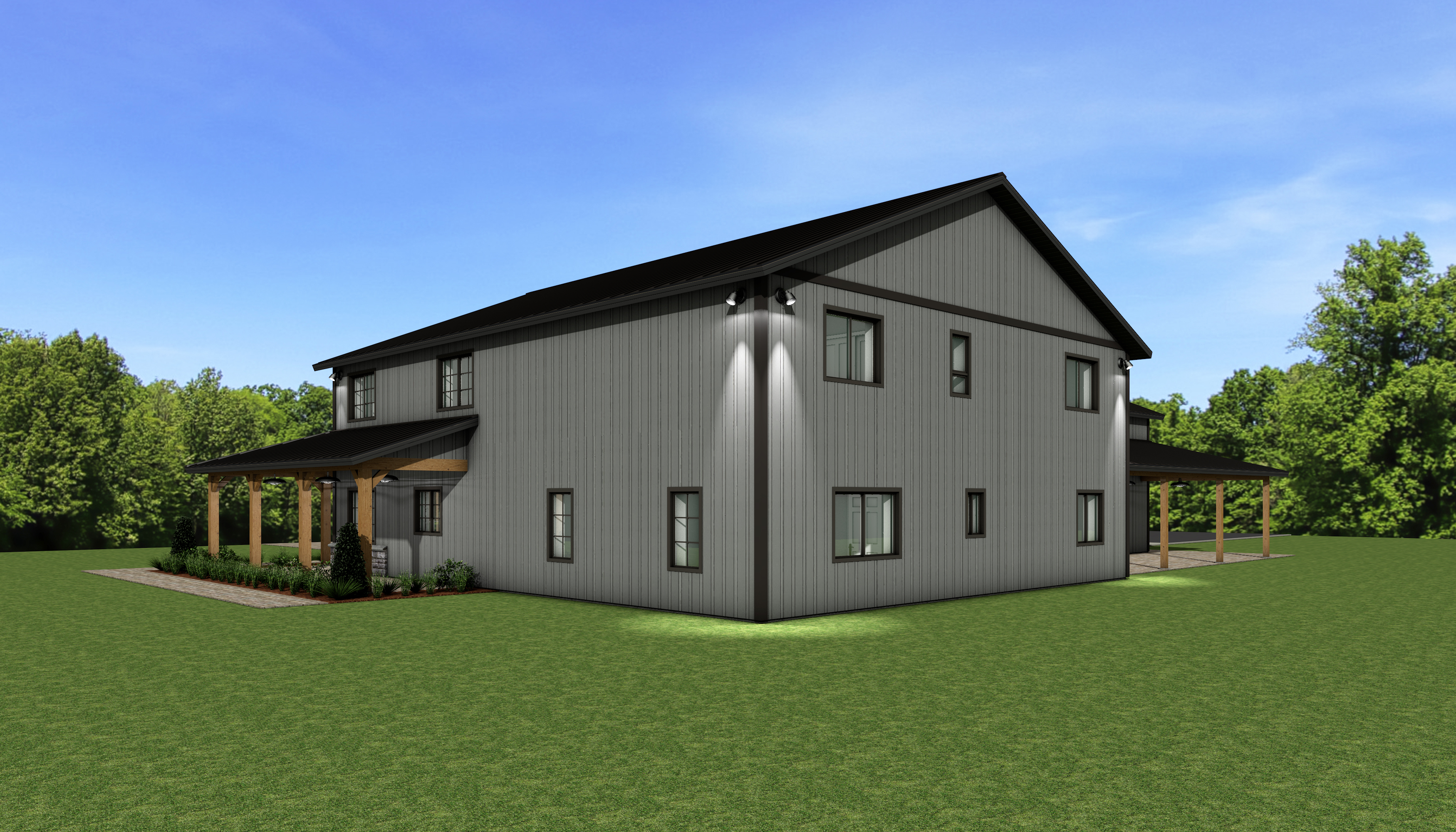 a modern two story house retain the exact structure colors and window arrangement rooflines siding foundation height porches and proportions exactly as shown in the reference image all roofs are black metal as shown integrate into the terrain there is a lush dense forest of mixed hardwoods that further back behind the structure add cooler afternoon sunlight subtle dappled highlights across the siding and grass create ultra realistic lighting crisp shadows detailed textures in the siding and glass reflections and an overcast sky show only a few lights visible inside render in hyper realistic architectural photo visualization quality 8k resolution add a driveway tying into the concrete garage door apron make it the summer season keep cobble sidewalk out front