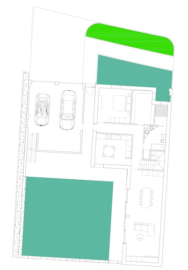 create a high quality architectural rendering of a modern house floor plan with a sophisticated and inviting atmosphere use a blend of calming and elegant colors depict the garden areas in a vibrant green to suggest lush landscaping the interiors should be warm and welcoming with neutral shades like beige soft grey and white for the walls and floors complemented by rich dark wood accents for furniture and details show the driveway with sleek modern vehicles the overall atmosphere should be bright airy and modern with natural light flooding the space