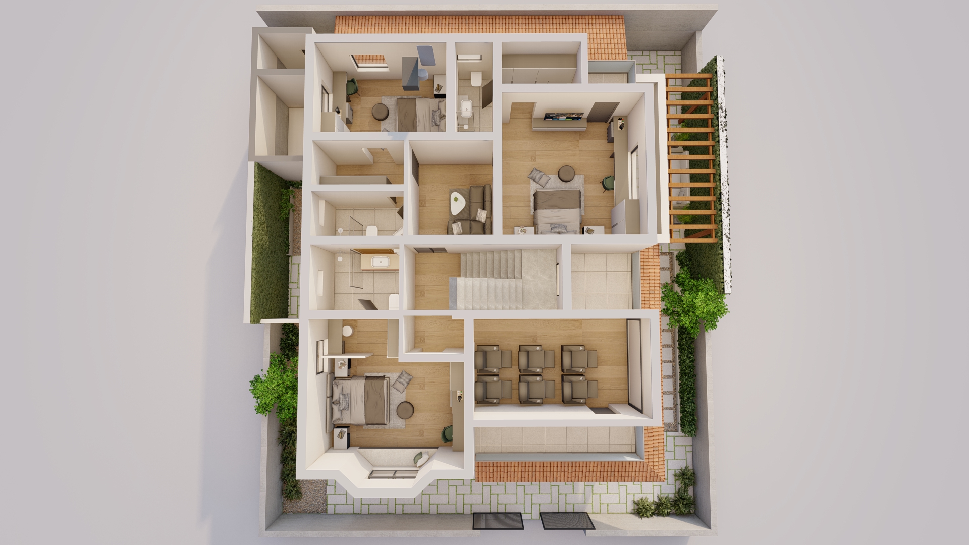 generate a high resolution presentation quality realistic isometric render of the provided space preserve all existing materials textures finishes and the exact original color palette without any alteration maintain the precise geometry furniture placement and surface detailing as shown apply soft neutral white ambient lighting with very low shadow intensity ensuring uniform illumination and high material clarity across floors walls ceilings and furniture avoid dramatic lighting harsh contrasts or stylized effects focus on crisp edges accurate reflections refined global illumination and clean visual balance delivering a polished professional architectural presentation suitable for client review