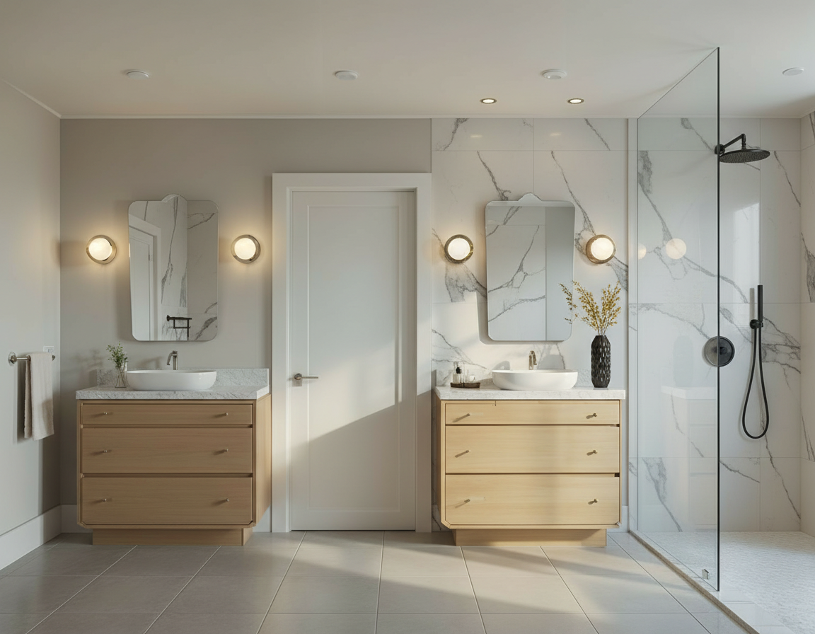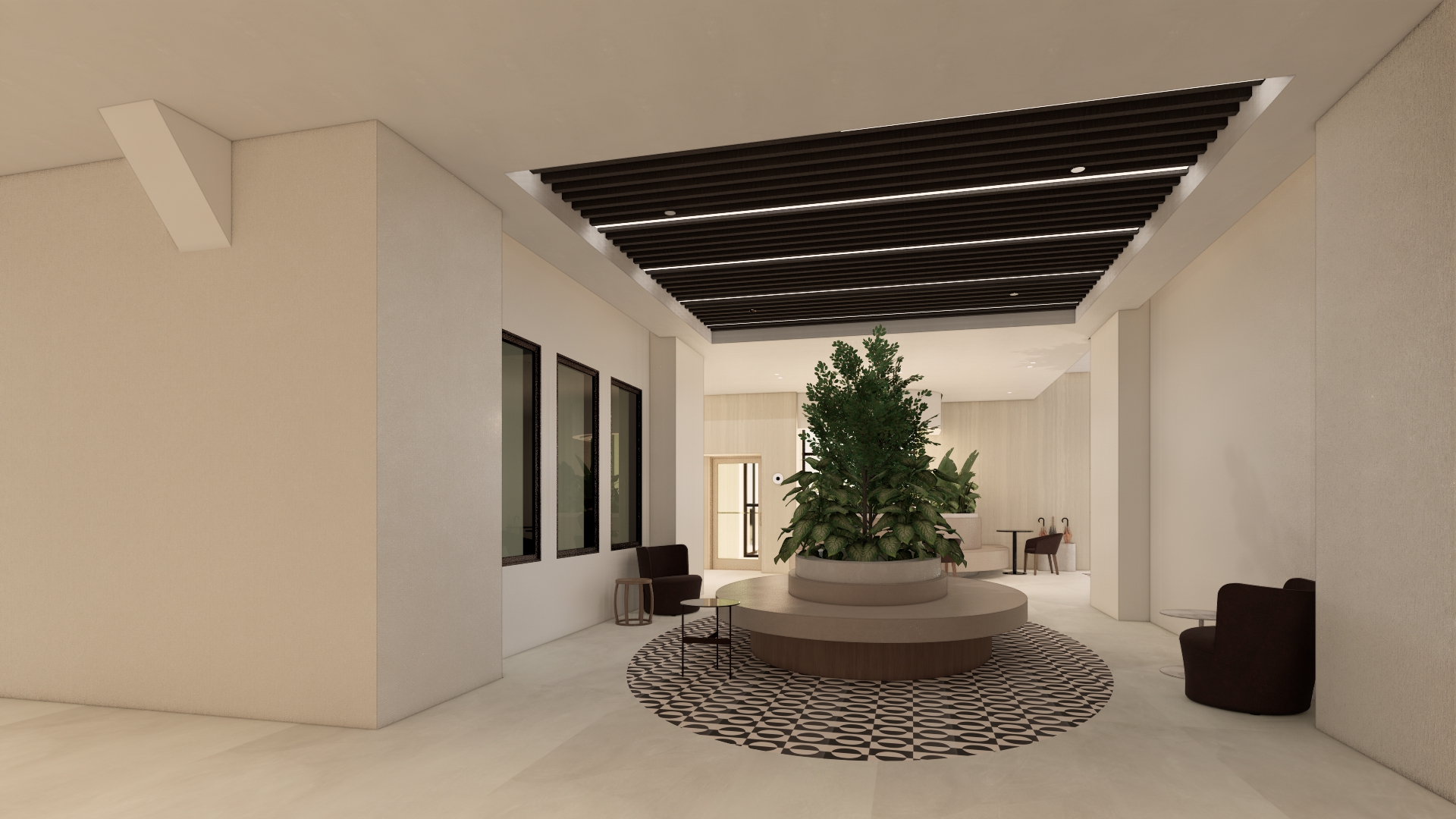 light matte marble floor and plaster walls add people seating at soft plush beige leather bench around planter add a slim metal transition between pattern tile and marble floor keep furniture as shown