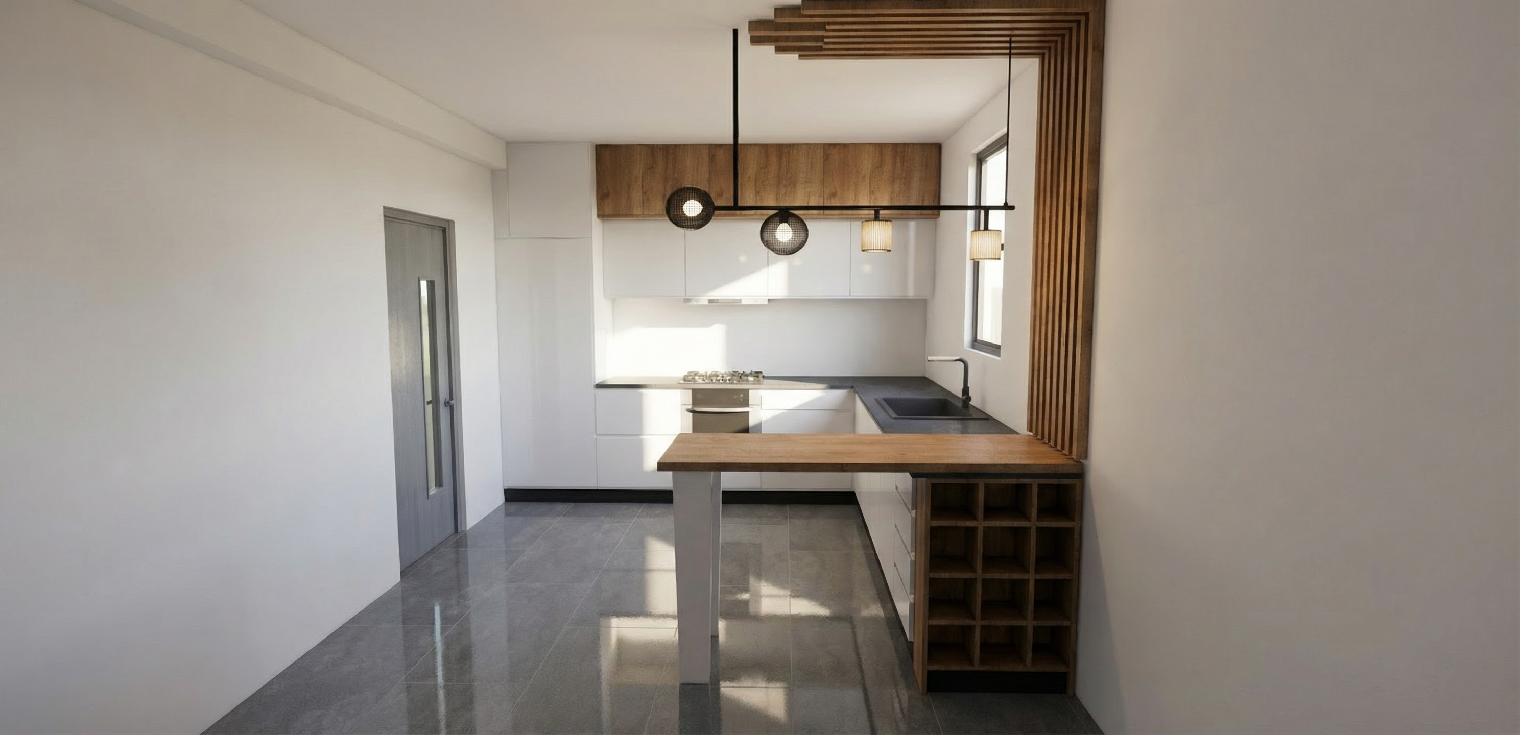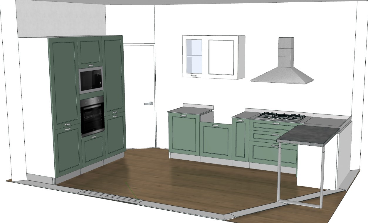 render fotorealistico cucina anta verde con telaio per basi e colonne i pensili sono bianchi con telaio quello a sinistra ha telaio con vetrina maniglia e zoccolo argento satinato piano di lavoro bianco gesso bancone grigio medio spatolato con gambone color alluminio satinato dove c la basa piu bassa aggiungere lavello bianco vintage in porcellana con miscelatore acciaio inox ambiente molto luminoso atmosfeta accogliente