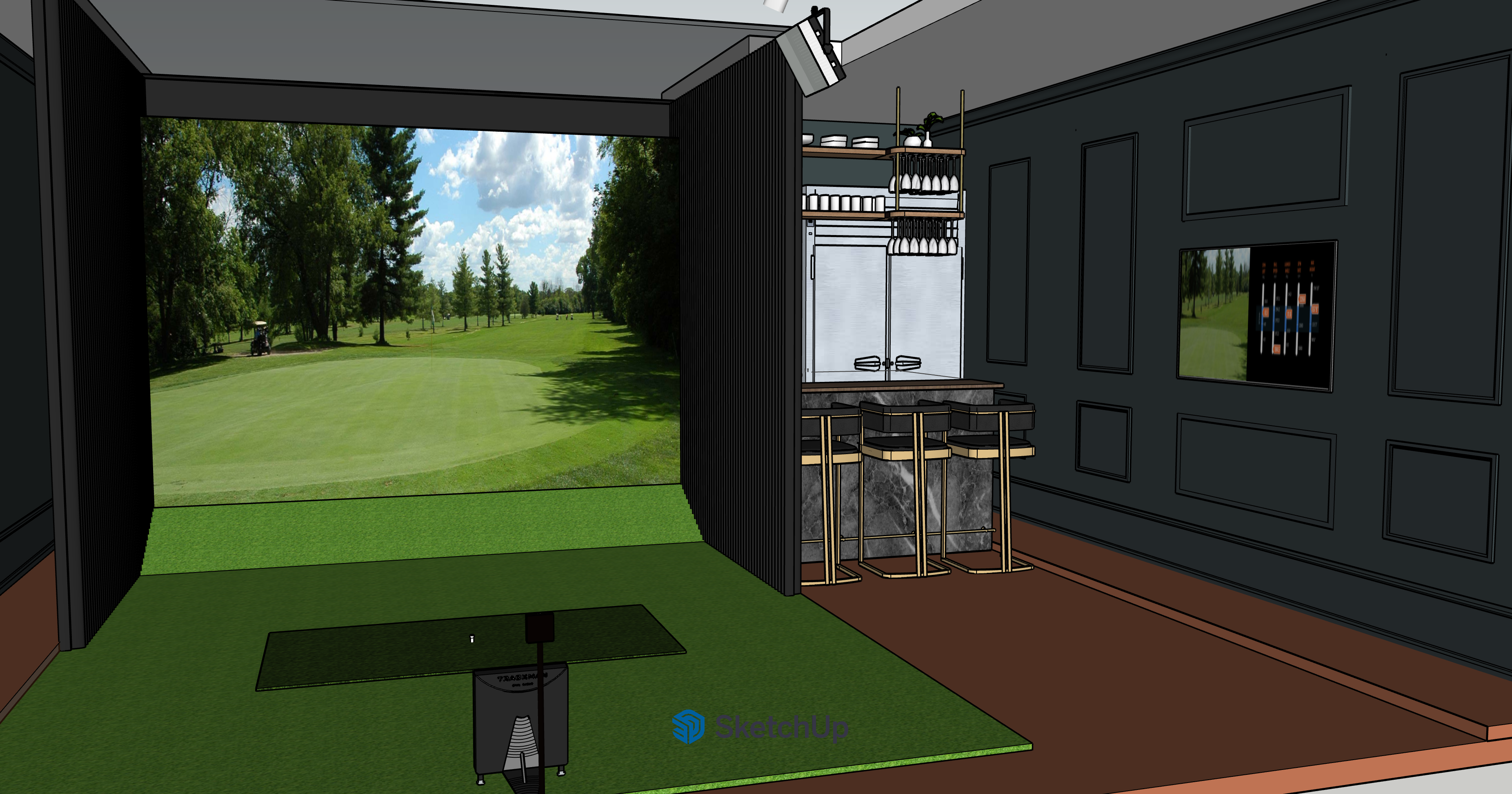 overall feel is luxury elevated and moody the space is a garage conversion with recessed lighting on ceiling and finished painted drywall with molding accents and terracotta stained cement floors there is a large golf simulation screen that illuminates the room in front of the screen is faux grass for putting and swinging there is a bar with walnut top brushed brass metal legs and marble face front above the bar is suspended shelving hanging from soffit ceiling and has glassware and wine glasses hanging there is a refrigerator in the back right corner