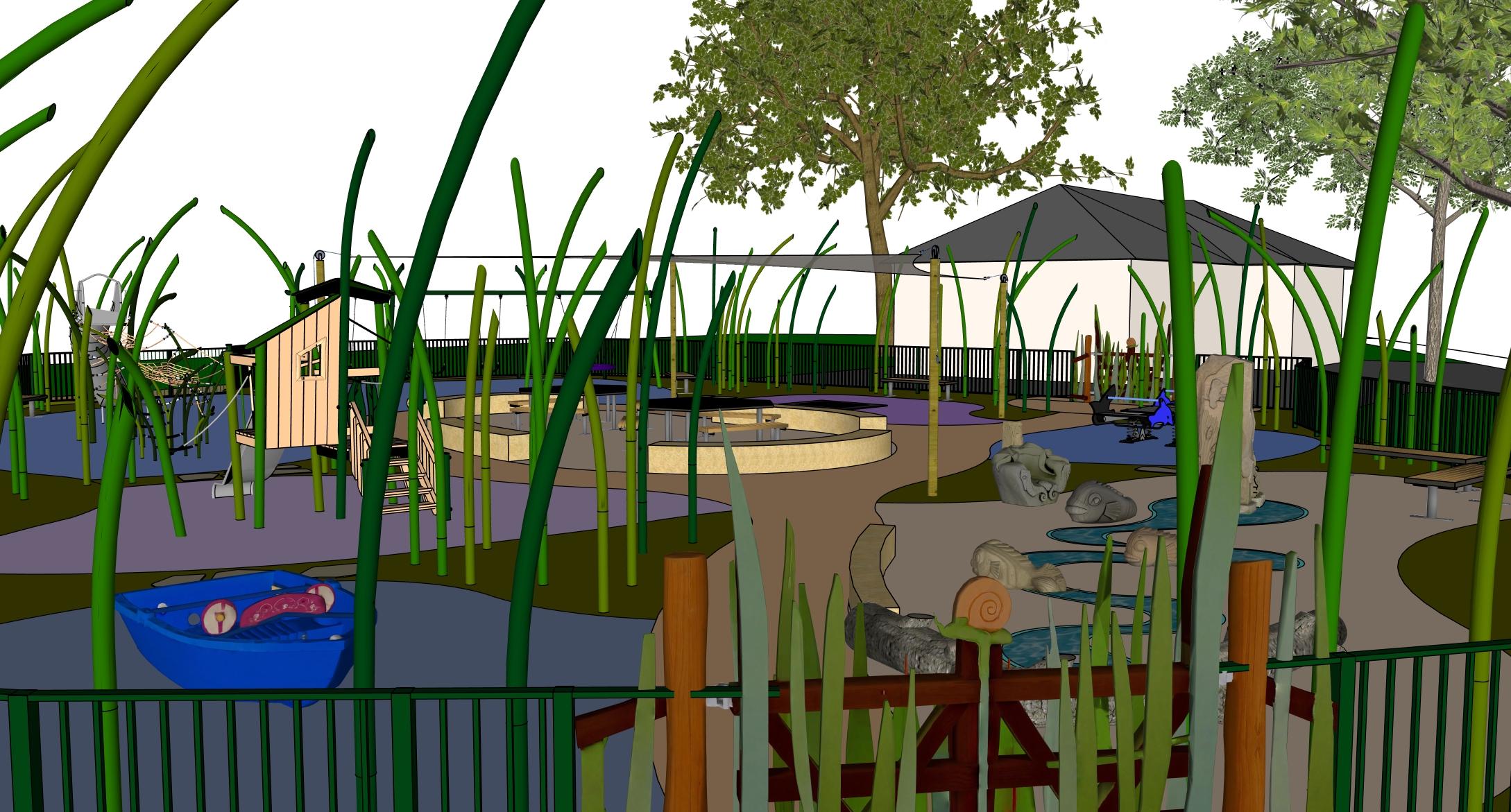 a children s playground with colorful play equipment and safe rubber flooring the surroundings include greenery such as lawns trees and low shrubs daylight scene warm and welcoming atmosphere realistic architectural visualization with high level of detail
