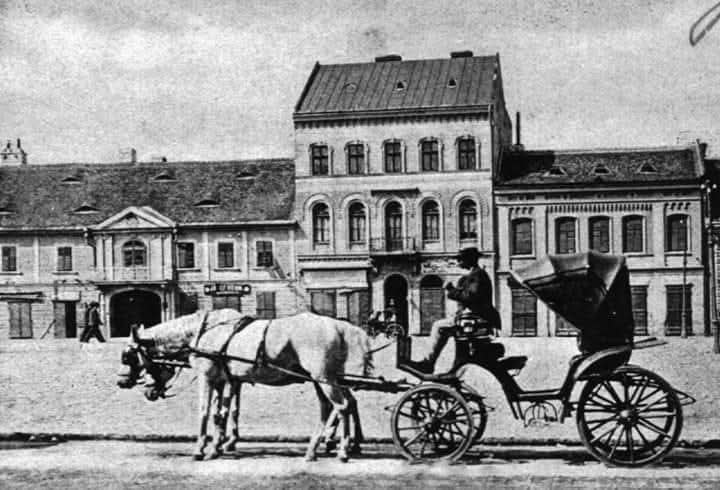sunny day with dreamy clouds shadow from opposite direction paved plazza in 1900 style