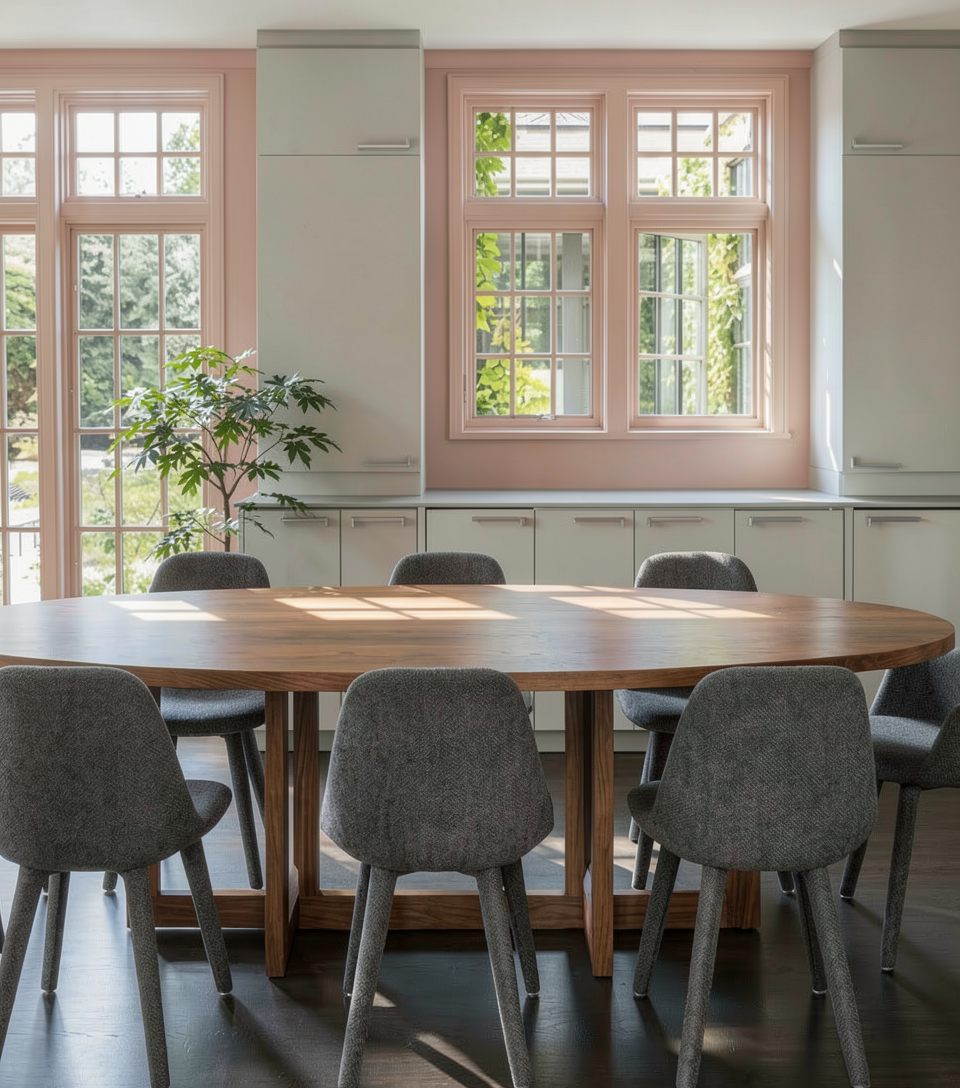 change cabinetry to dark grey glossy finish adjust wall and window trim color to be slightly lighter and less pink and more beige