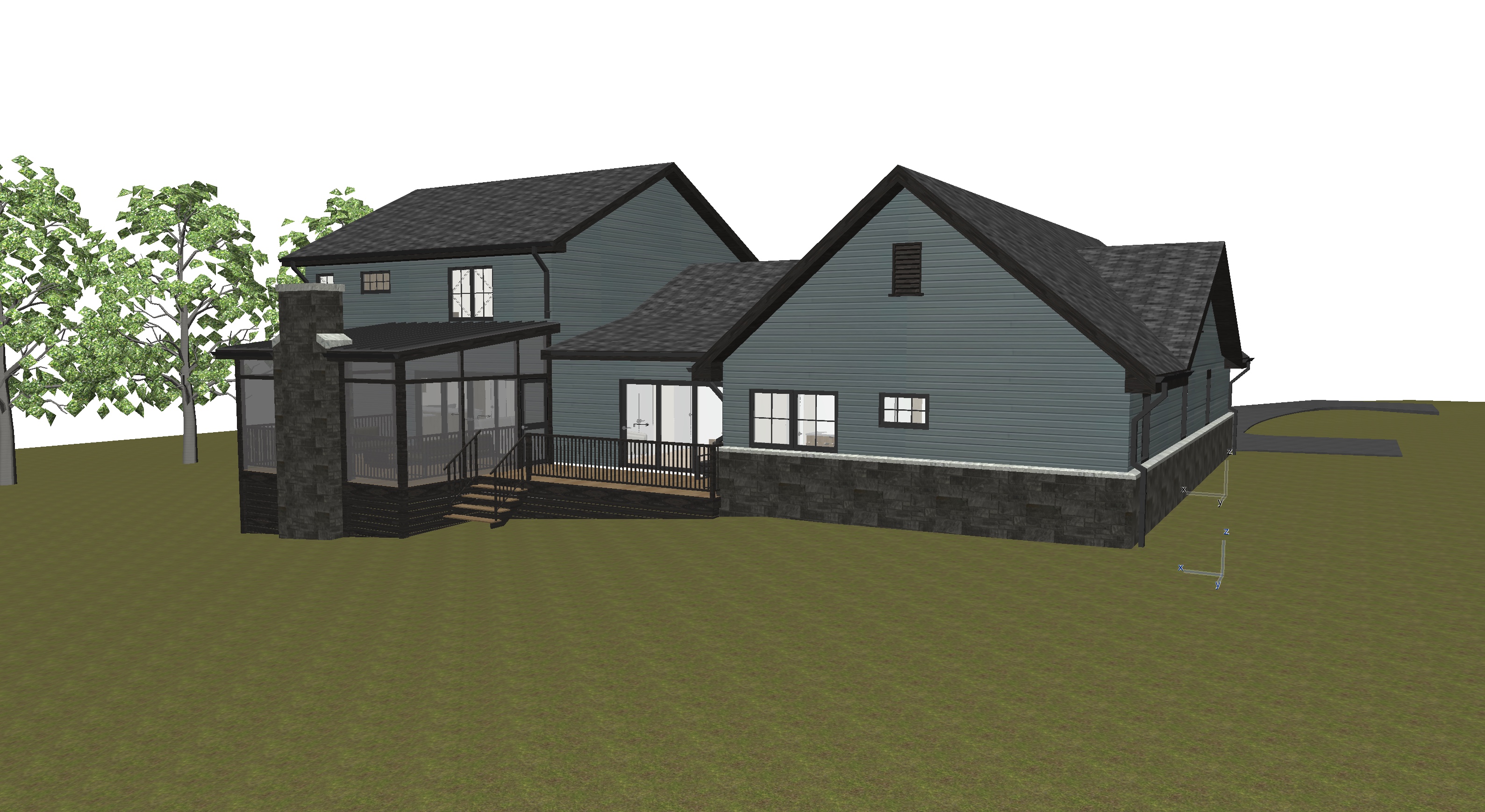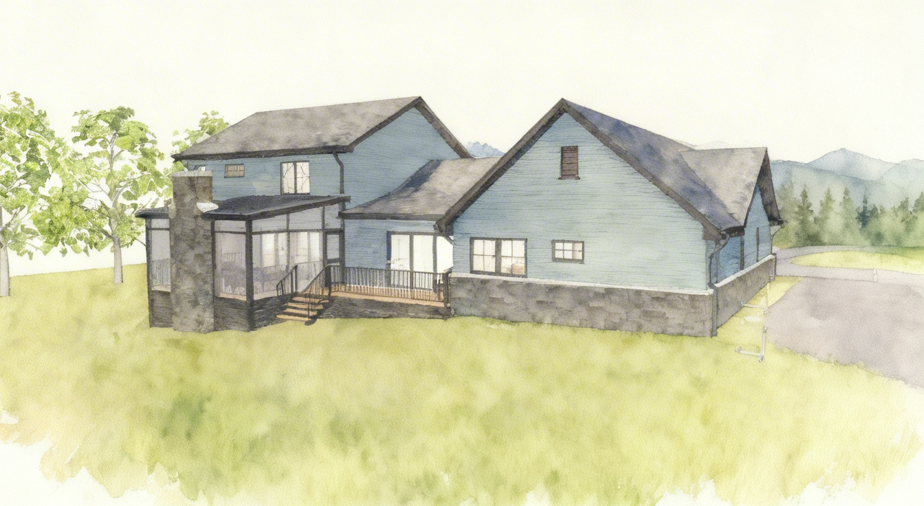 grainy watercolor rendering of home with low distant tree covered mountains in the background
