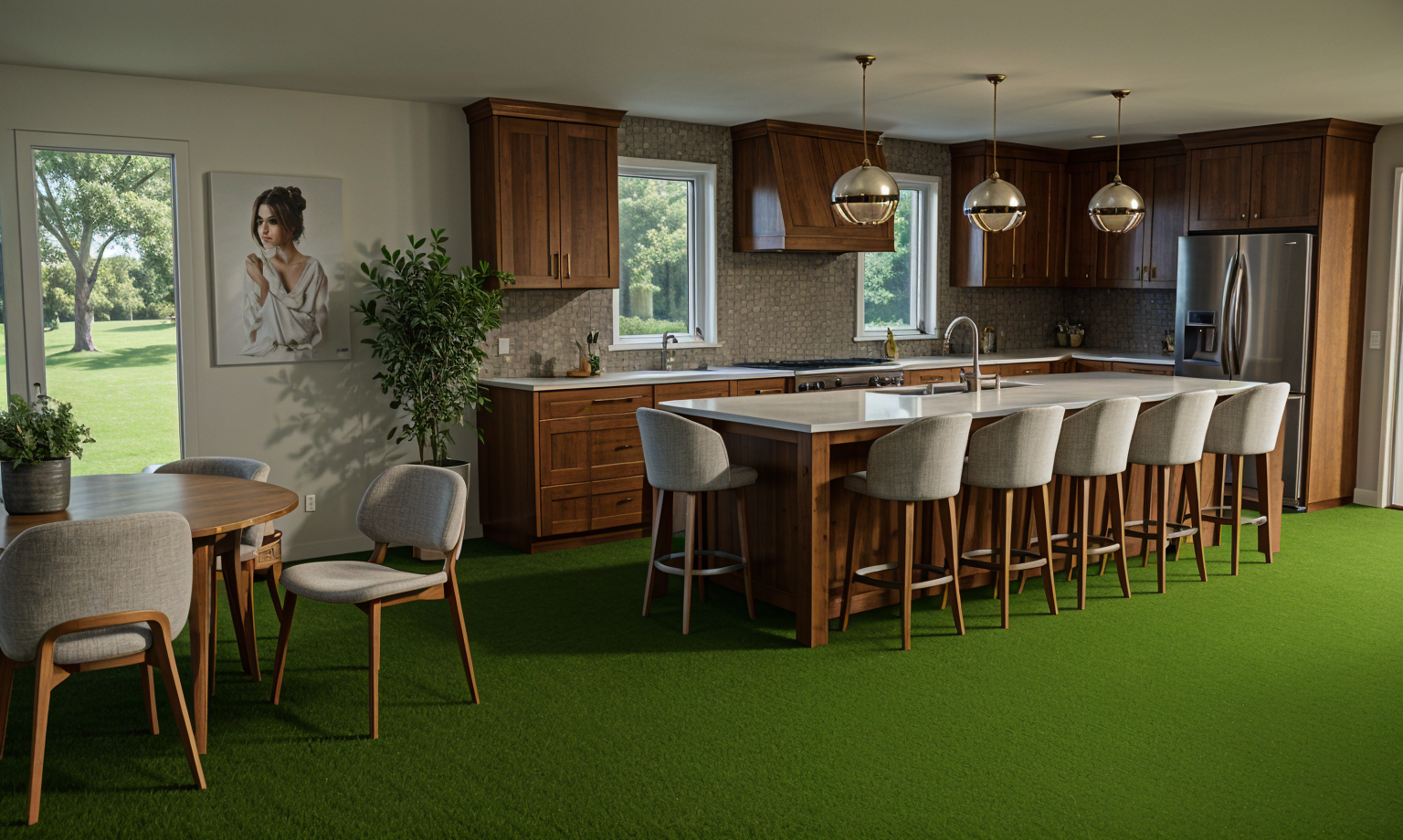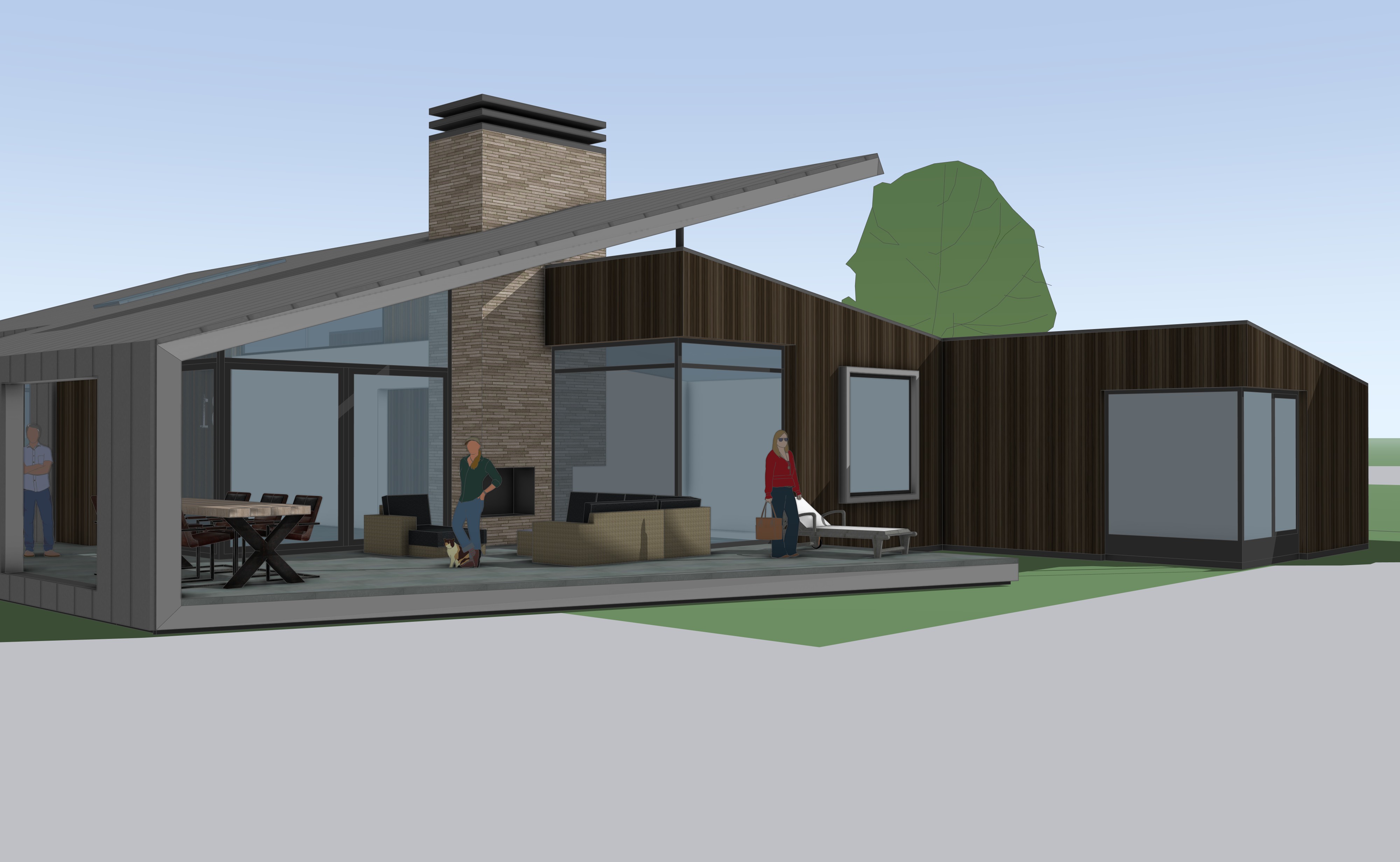 the house is surrounded by a lush green garden with grass bushes flowers and a lot of trees the weather is sunny with a few clouds in the sky