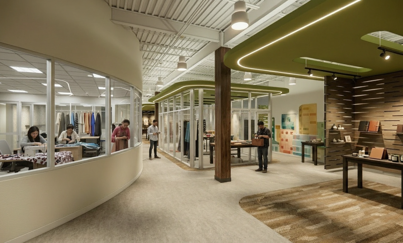 change pod in the middle to have someone making food sauces add display tables with different food sauces on them do not change any elements of the original image