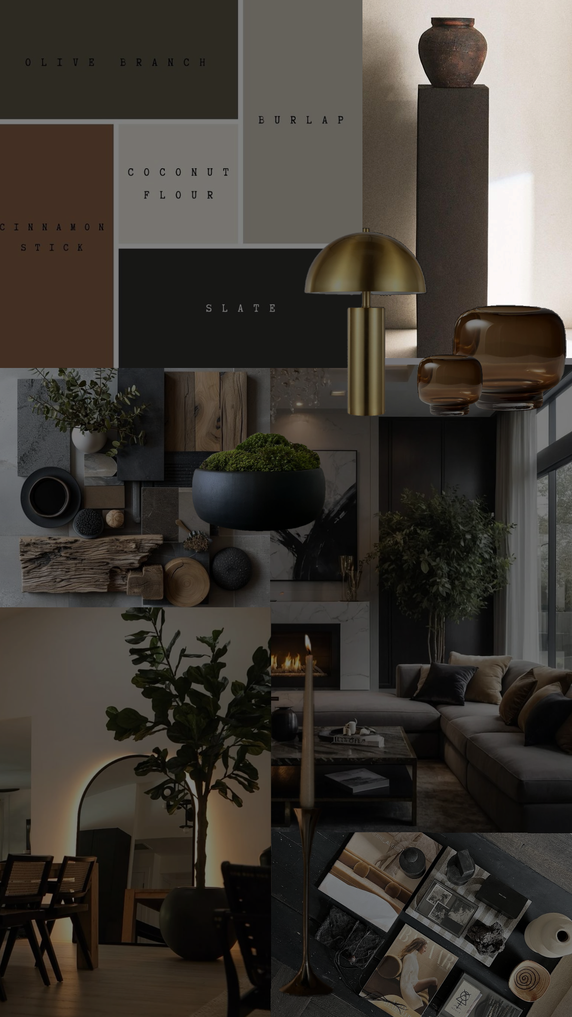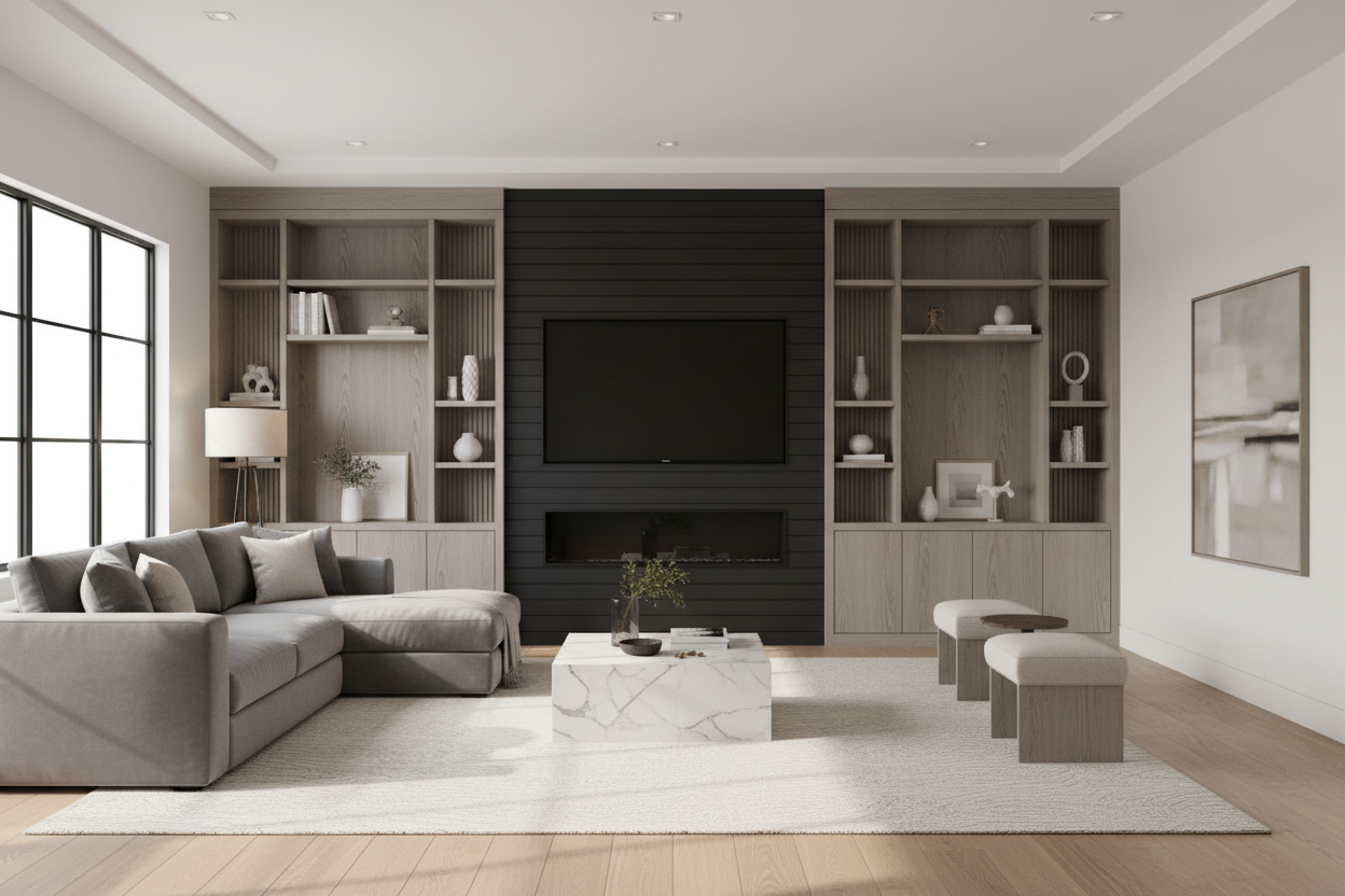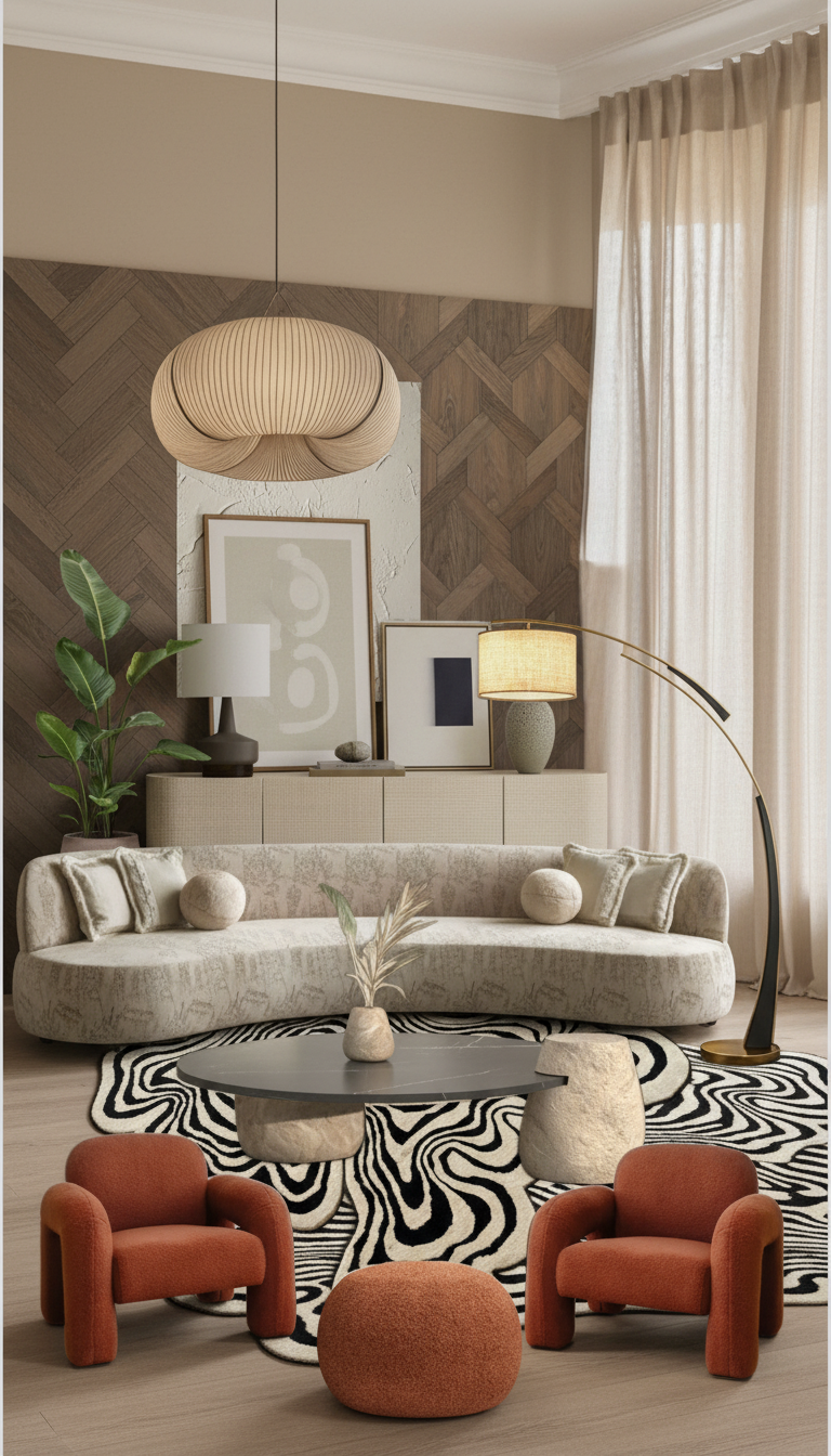 create a cozy and contemporary living room with neutral and earthy tones the walls feature light beige textured plaster and warm wooden panels a large plush beige sofa with matching circular cushions is the centerpiece accentuate with plush rusty orange armchairs and a matching pouf add a modern black and white zebra patterned rug under a sleek dark oval coffee table with beige round supports include a floor lamp with a curved golden base and a soft cream lampshade incorporate leafy green indoor plants for a touch of life embrace natural daylight with sheer beige curtains creating a warm and inviting atmosphere