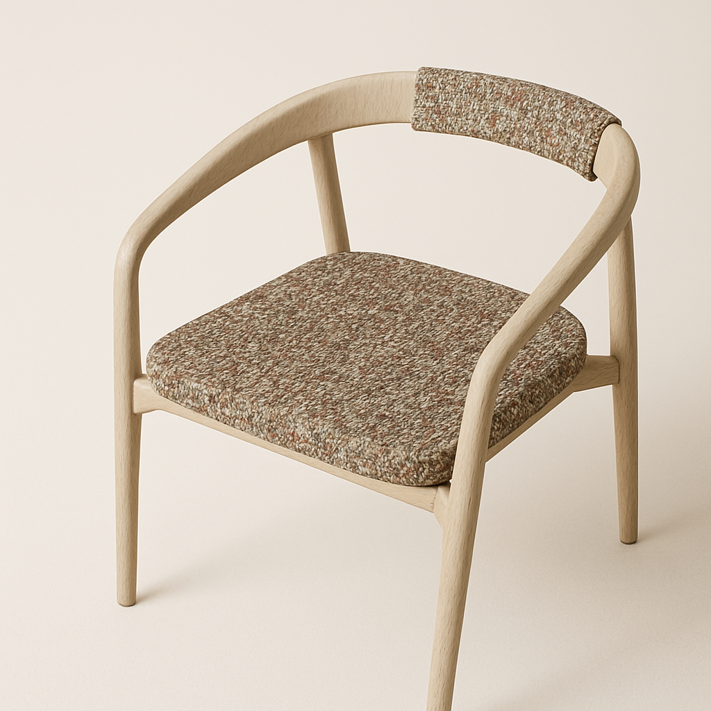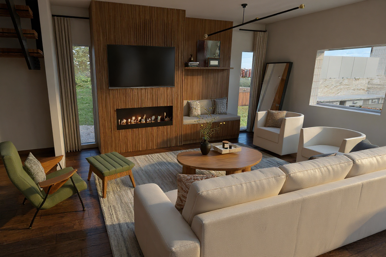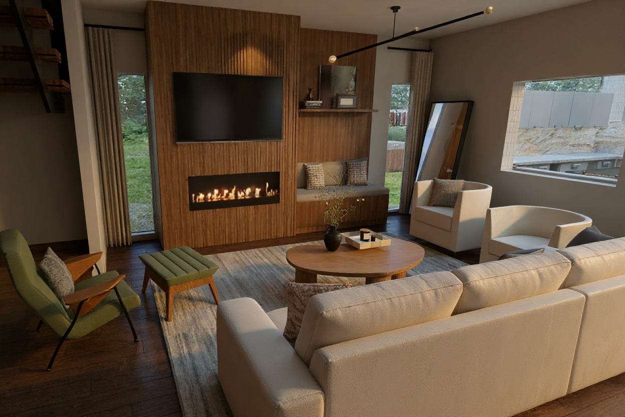 transform the provided living room interior image into a high end photorealistic render with a bright and airy atmosphere soft glowing highlights and relaxed upscale energy while keeping everything exactly the same same proportions same color of wood same wall color same ceiling light fixture same wall finishes same beige pattern curtains same materials and same spatial configuration do not move or alter any objects geometry textures colors or furniture positions the chairs throughout the living room must remain exactly in the same locations and proportions but their materials should read realistically the chairs should appear upholstered in soft chenille beige fabric with subtle natural sheen and cushioned tactile texture lighting should emphasize bright and airy gentle reflections soft shadows enhanced color richness and luxurious catalog level realism improve depth and realism through soft white oak wood grain richness shine brass highlights fabric texture and polished clarity while keeping the entire scene exactly as originally designed