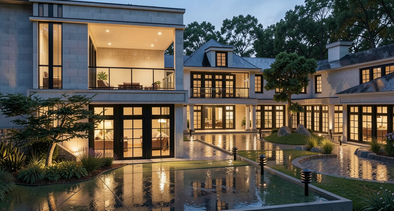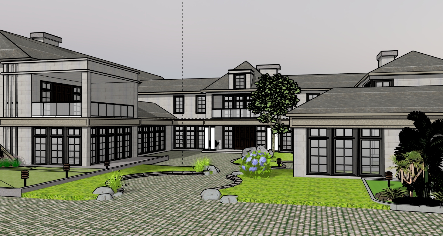 spring time almost noon sharp lights black frames trees more realistic at the back ground show trees inside the buildings show furniture the windows are darker the lights in landscape should be realistic and metal material