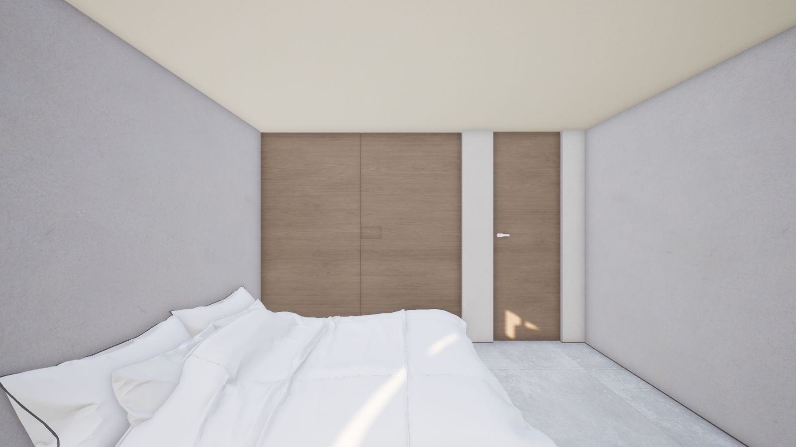 create a photorealistic 3d image maintain real sizes as shown add a tv in front of the bed and a painting in the wall behind it