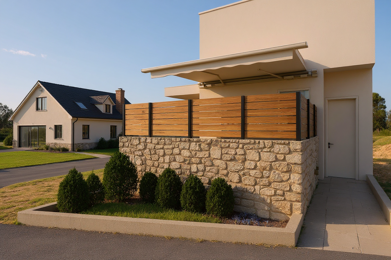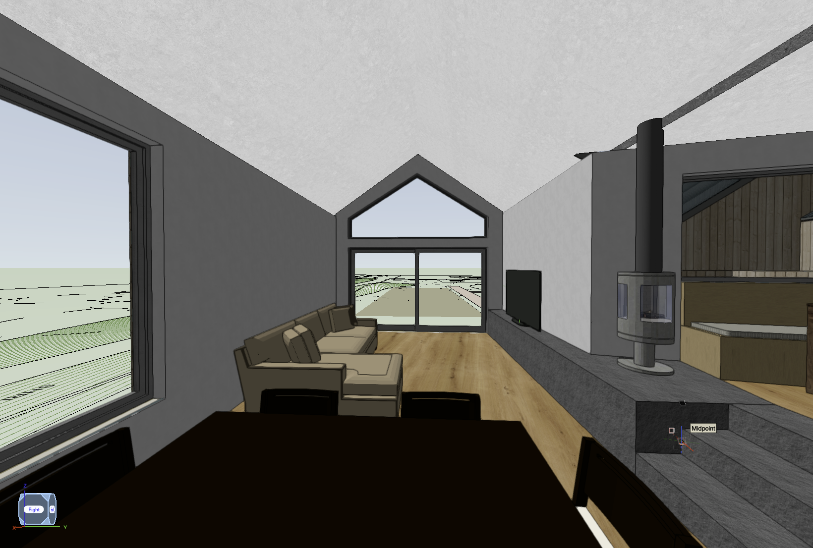 interior shot comfortable lighting photorealistic view of woodland through window to left view of garden through large central window