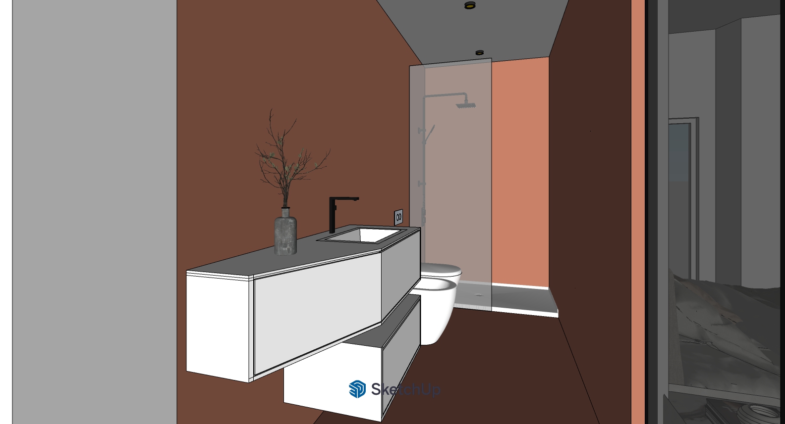 modern and minimalist bathroom with an elegant glass shower matte resin cladding matching flooring black bidet faucets and a white ceramic toilet the lighting is soft with ambient light and ceiling spotlights creating a relaxing spa like atmosphere the mirror is backlit do not alter the geometry materials or colors