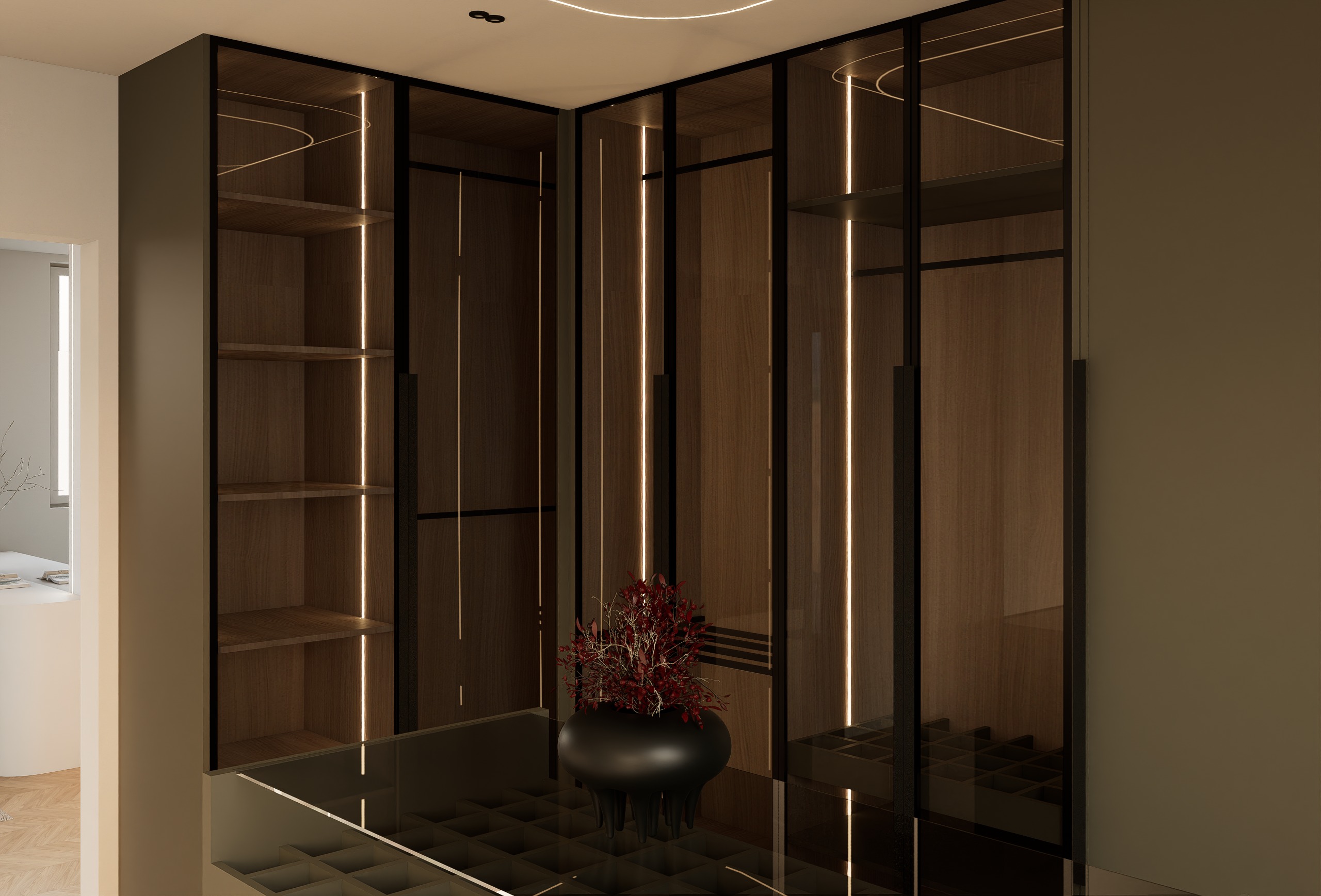 create an ultra photorealistic high end interior render of this walk in wardrobe space preserve the exact original design architecture layout cabinetry proportions island dimensions ceiling detail lighting placement floor pattern and camera composition do not redesign or move anything the goal is to make the existing render look fully real luxurious and editorial grade push the realism to a very high level physically accurate lighting and global illumination soft natural daylight entering from the right side window warm integrated led lighting inside the wardrobe realistic bounce light contact shadows and soft shadow gradients subtle cinematic contrast with refined highlights realistic lens response depth and premium interior photography feel material realism must be extremely strong dark wardrobe panels in deep warm charcoal bronze grey matte lacquer with soft sheen smoked glass doors with realistic reflection transparency and slight depth warm walnut wood interior with rich natural veneer grain subtle variation and luxury finish black metal framing and handles with elegant satin finish island with realistic painted finish and glass top with correct thickness edge reflection and clean specular highlights light oak herringbone floor with authentic grain natural tonal variation and realistic plank definition add realistic clothes inside the glass wardrobe to make the space feel lived in and premium a curated selection of elegant hanging clothes in luxury neutral tones sand taupe cream black graphite warm grey muted brown include a few structured jackets shirts long coats and neatly arranged folded pieces keep the wardrobe styling minimal and expensive looking do not overcrowd the closet garments should be naturally draped correctly scaled and softly visible through the smoked glass enhance the realism of all small details improve the vase and branches on the island so they look truly physical and high end refine glass reflections and interior shadows add subtle imperfections only where needed for realism never making the scene messy keep edges sharp and premium not soft or blurry make the render look like a luxury interior photography shot from a top architecture studio overall mood calm luxurious sophisticated warm minimal cinematic editorial ultra high end residential interior visualization negative instructions do not change the design do not change cabinetry layout do not change materials into different colors do not add new furniture do not alter the ceiling lines do not change the island form do not overcrowd with styling do not make it look artificial or overprocessed