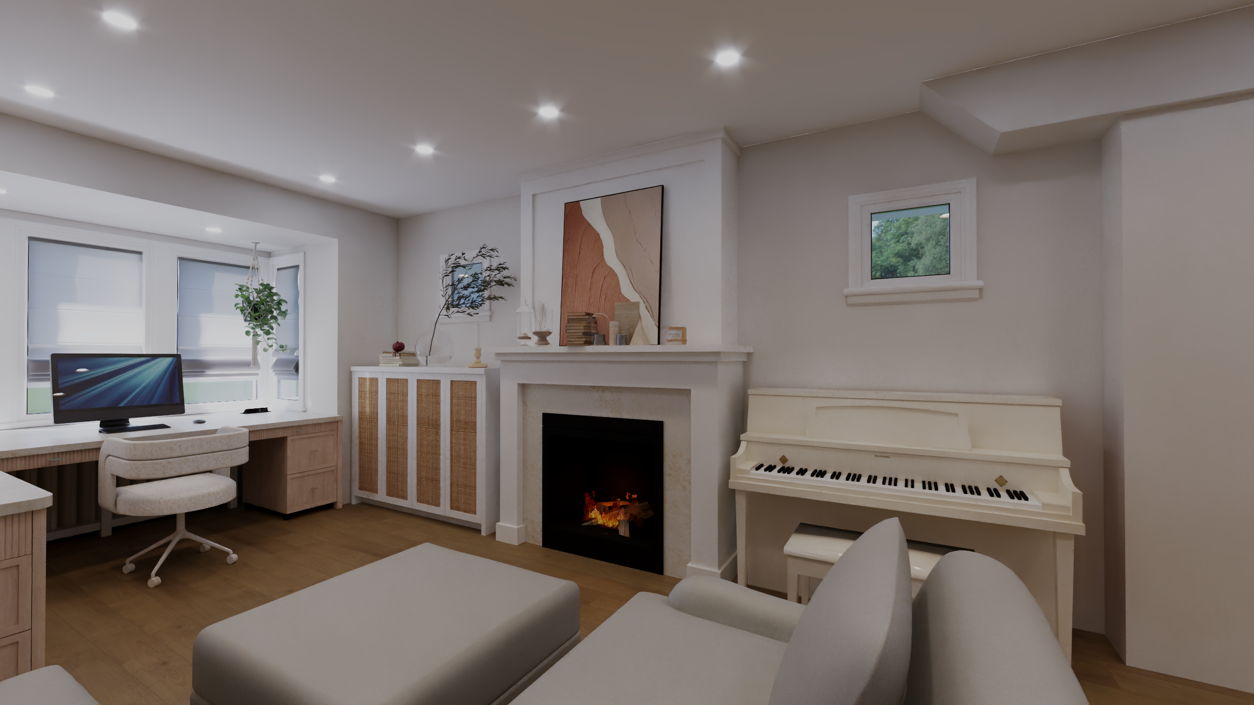 cozy contemporary living room with a warm and inviting atmosphere soft neutral color palette featuring off white warm walls and ceiling the wooden floor is a rich honey oak complementing the natural textures of the room the desk and cabinetry are crafted from light oak a modern ivory piano sits against the wall exuding elegance comfortable sage green velvet furniture is arranged for relaxation around the center fireplace which emits a soft golden glow a striking abstract painting with earth tones including terracottas and soft beige hangs above the fireplace the room is gently illuminated by recessed ceiling lights creating a peaceful ambiance greenery from potted plants adds a refreshing touch balancing the space large windows invite natural light casting soft shadows throughout the room