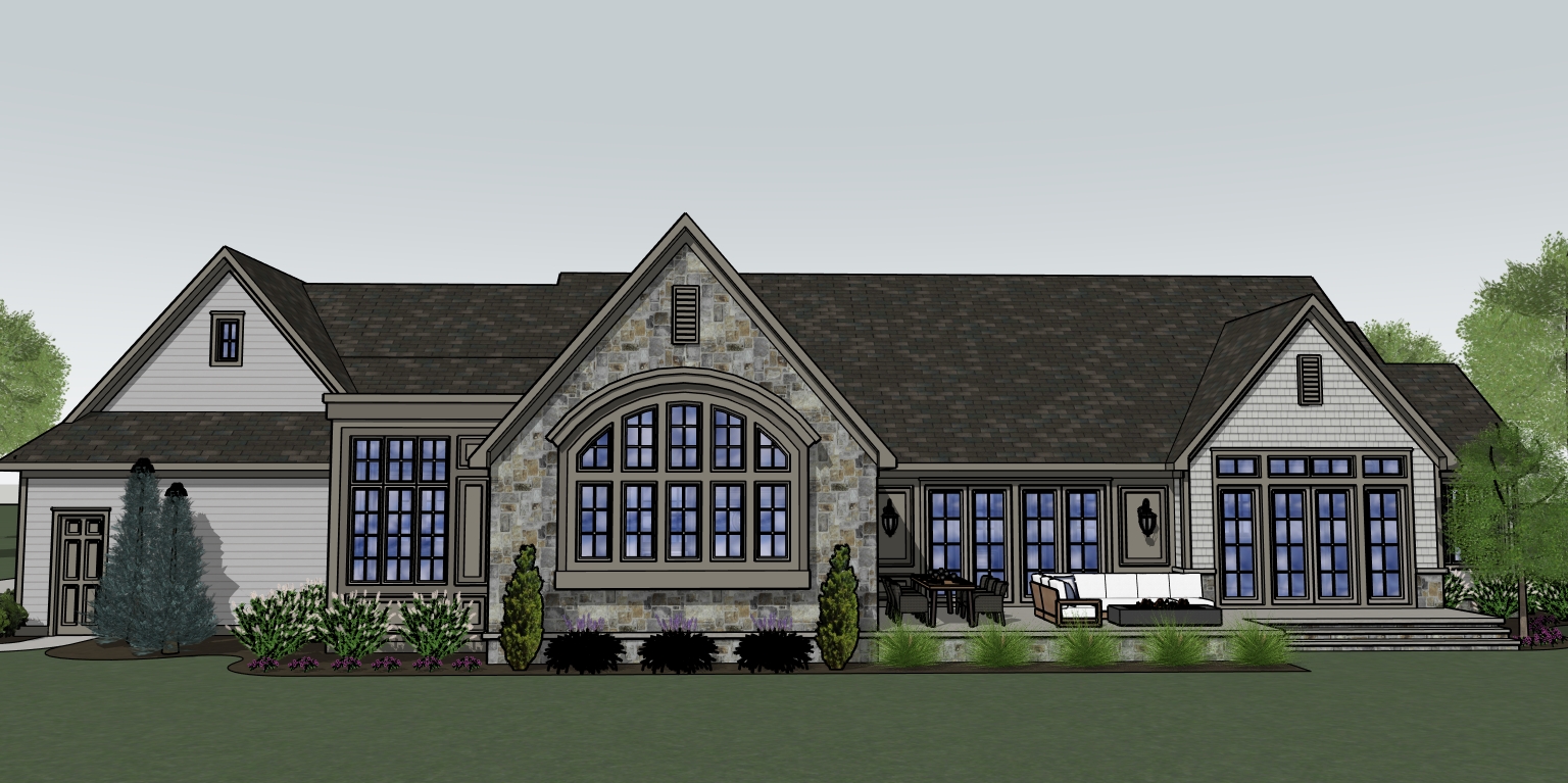 partly cloudy sky pella fossil windows deciduous trees in background off white color siding