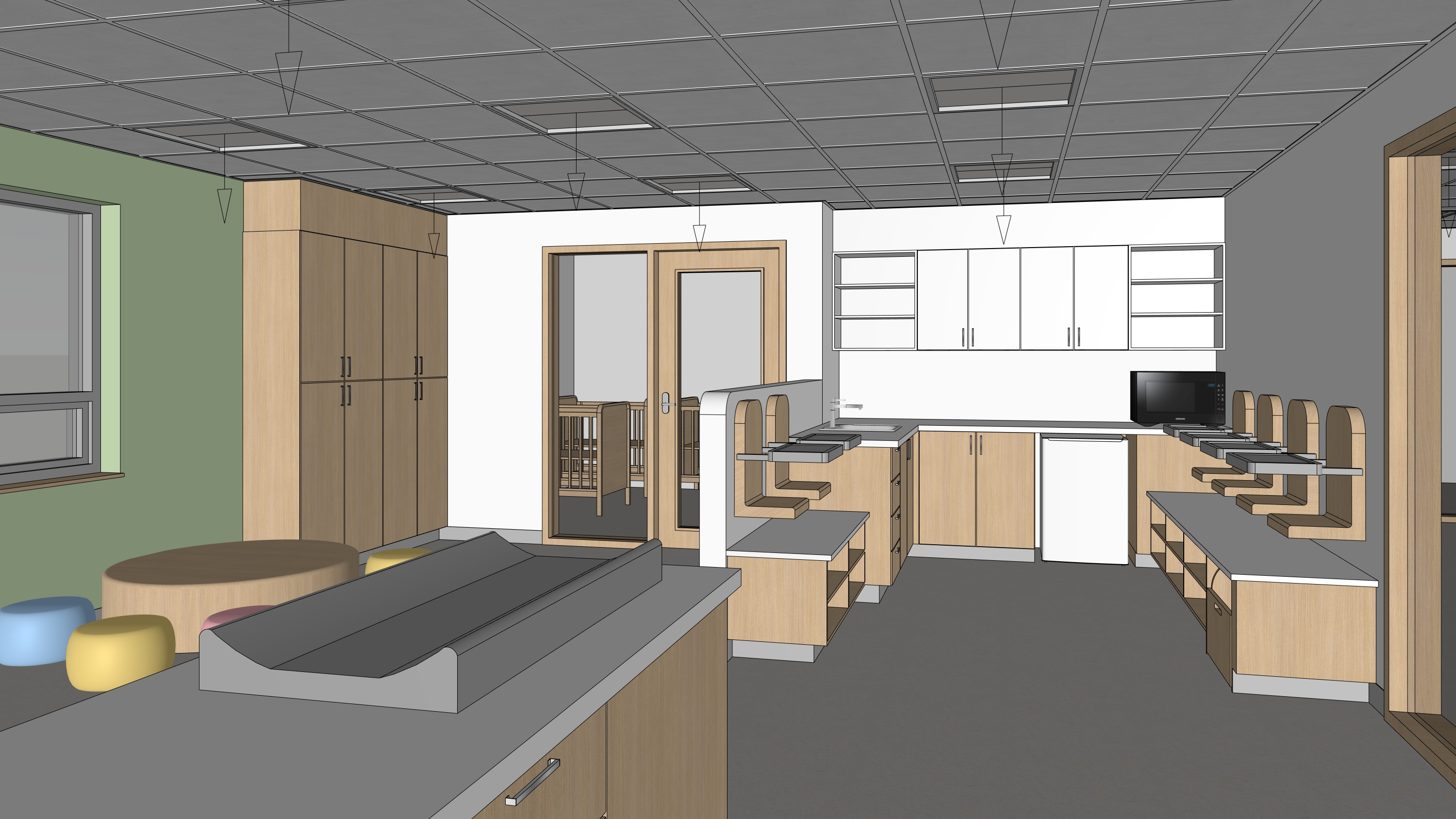 photorealistic architectural interior render of a childcare center cpe based strictly on the provided sketchup image do not add remove or modify any architectural elements furniture openings or layout keep all objects proportions and positions exactly as modeled all existing ceiling light fixtures must be turned on and emit soft realistic illumination combine artificial lighting with natural light if present keeping a balanced and believable exposure preserve the original colors and materials but enhance them with realistic textures accurate material properties and subtle imperfections soft wood grain fabric softness matte finishes child friendly clean calm and warm atmosphere suitable for a cpe environment realistic global illumination soft shadows correct scale neutral camera perspective no dramatic effects no stylization no artistic interpretation ultra realistic architectural visualization professional quality natural color grading no new furniture no extra decor no change in layout no change in wall positions no change in ceiling design no natural light from the doors glasses interior door all walls and ceiling must remain their orginal colorsdo not add new light fixture in the furniture