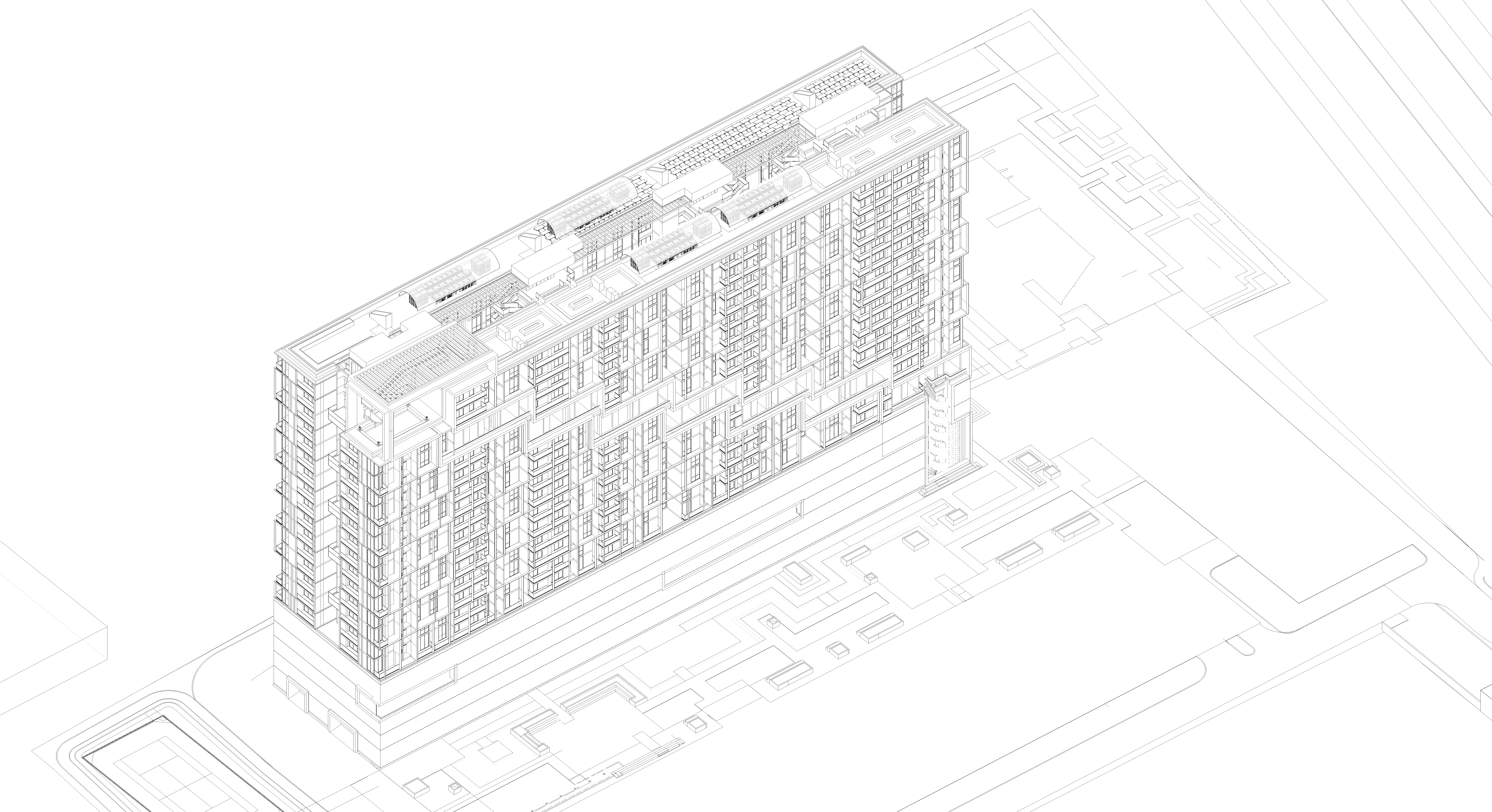 photorealistic rendering of a modern high rise residential building maintaining the original architectural details and materials the rooftop is a vibrant landscaped space with greenery planters pergolas and seating areas the podium carpark is wrapped with a lush green landscape screen realistic sunlight soft shadows natural sky and warm lighting keep the perspective and proportions from the original model