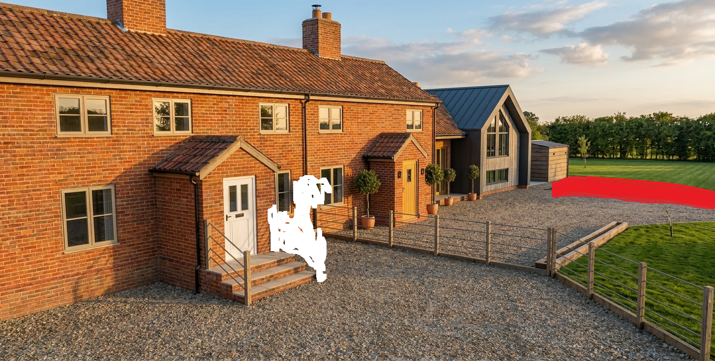 make the red area matching the driveway and repair the areas of white where i have erased some objects i did not want