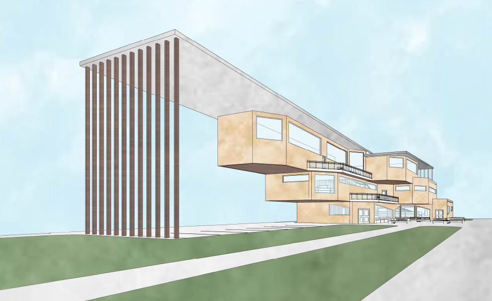 render a modern minimalist exterior space with sleek design mass timber structure giving a warm and welcoming feel the roof should be made of metal decking providing a subtle contrast the atmosphere should be calm and serene