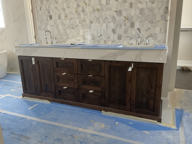 do not change the cabinets in any way preserve the exact cabinet colors materials finishes dimensions door and drawer styles hardware spacing alignment and all geometry exactly as shown do not alter the countertop shape backsplash appliances flooring lighting fixtures or wall structure only remove the construction materials clutter and mess from the scene clean the room and make it look finished and staged add a few simple tasteful home accessories appropriate for the style of the space but do not add or remove any furniture windows or architectural elements maintain the original lighting direction and realism enhance clarity and polish the photo while keeping the cabinetry and room design completely unchanged do not alter the lighting to keep the cabinet colors as they are in the image add new flooring stage the countertops for a luxurious master bathroom add chrome mirrors above the sinks add chrome cabinet pulls to the door and drawer fronts