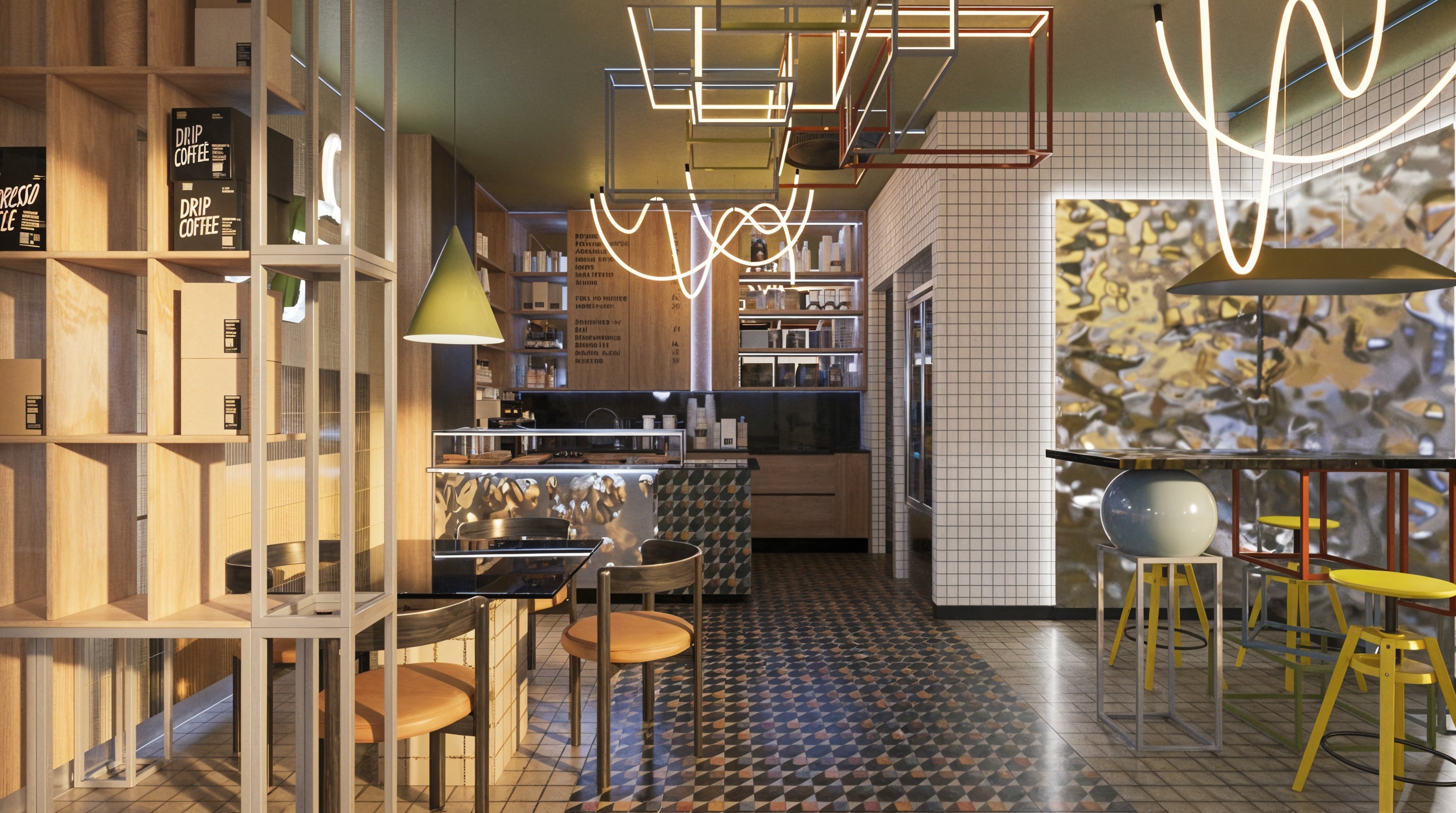 convert the image into a realistic indoor photograph with professional architectural aesthetic maintaining 100 of the geometry and layout applying authentic materials afternoon warm lighting with soft shadows and a sharp photorealistic result brighten the rendering make the tiles on the floor look realistic without changing the colors and pattern