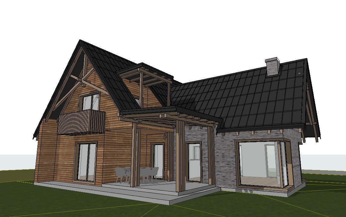 modernist exterior shot a beautifully rendered modern minimalist house set amidst a serene natural environment the house features angular wooden structures with a dark gray and black exterior large glass windows reflect the subtle hues of the surrounding landscape the wooden siding has warm earthy tones like soft browns and is combined with sleek contemporary black trimming the atmosphere is tranquil and the lighting is soft mimicking a gentle morning or late afternoon light the ground is adorned with patches of green moss and vivid yellow wildflowers adding a burst of color and life the surrounding trees are leafless drawn with delicate thin black lines indicating the late autumn season shadows of the trees create an intricate pattern on the house and the ground in varying shades of gray and brown the entire setting feels both modern and natural embracing simplicity and elegance architecture white facade keep windows from concept the background is forest please preserve the architecture and proportions of the building behind the building we have a slope and a forest