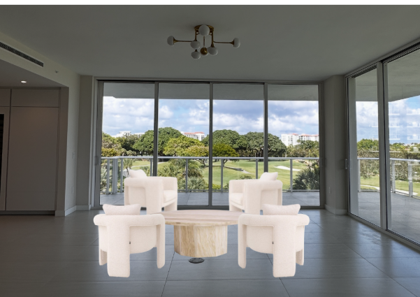 render prompt create a realistic interior render of the existing scene without changing the layout camera angle or any furniture placement adjust the lighting to a bright sunny daytime atmosphere with soft natural sunlight entering the space enhance all material textures especially wood fabrics and wall finishes so they appear richer and more tactile add a rug that fits proportionally within the seating area and complements the overall palette increase ambient brightness while keeping a soft natural balance not overexposed turn on all decorative and architectural lighting to create a warm layered effect incorporate light airy sheer curtains with a soft pocket drape to diffuse the sunlight and make the space feel lighter add subtle shadows and realistic reflections on surfaces like floors tables and decor to improve depth and realism overall mood light elevated warm and refined with a soft luxury feel
