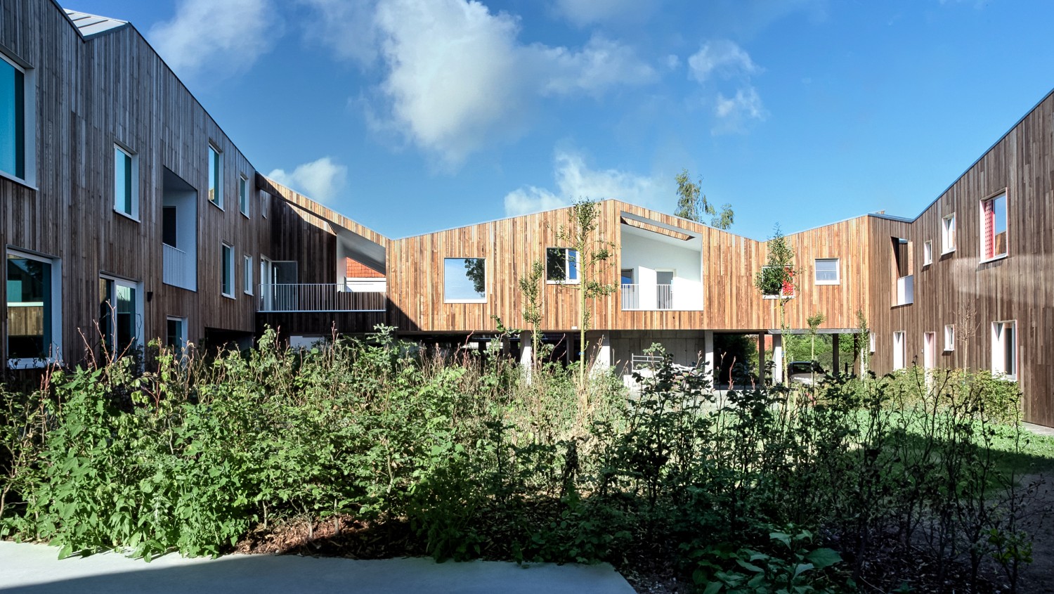 exterior shot reate a photorealistic rendering of this design an ultra photorealistic architectural visualization bathed in warm soft golden hour sunlight maintain the building s volumes the facade is made of light gray bricks and natural wood panels the roofs are anthracite colored flat tiles focus on realistic textures add natural elements such as meticulously detailed green foliage blooming flowers and a perfectly manicured lawn emphasize realistic shadows and highlights creating depth and dimension the overall atmosphere should be tranquil elegant and inviting