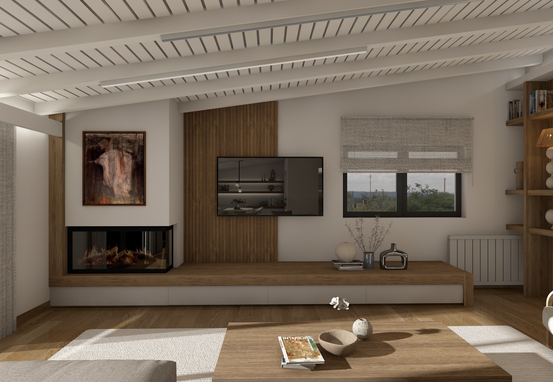 ultra realistic interior room with calm atmospheare linear lights thar are on the celling are on