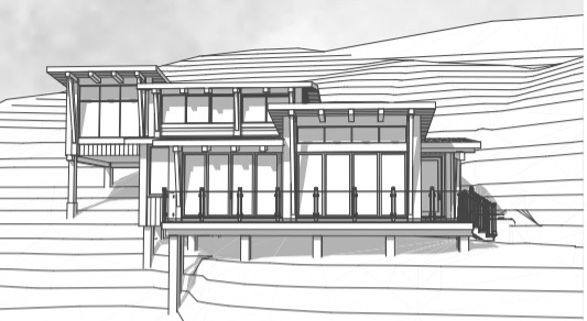 dark grey sidings and photo realistic remove skylight add trees in the background and some minimal landscaping on a mountain scene
